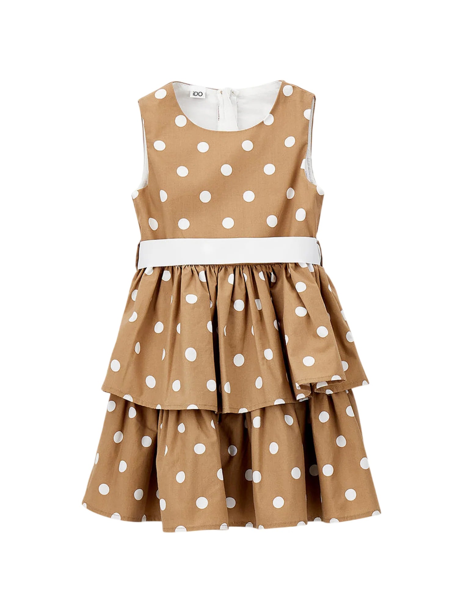Abito da bambina in fantasia a pois. Cintina in vita. Gonna a balze. 50% cotone 50% poliestere