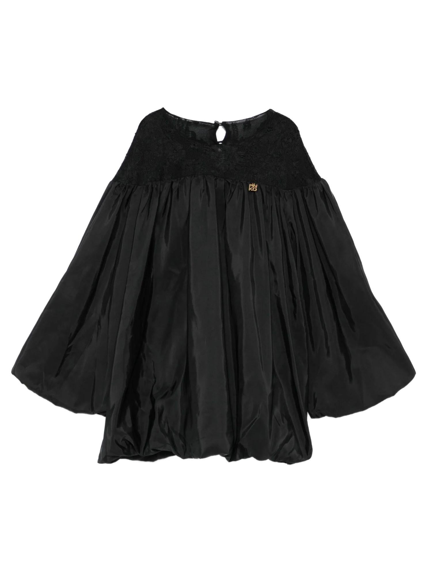 Abito da bambina caratterizzato da un design bimateriale. Lo scollo è in tulle con ricami floreali, il resto dell'abito in tessuto ottoman.Maniche lunghe e voluminose. Linea morbida e ampia. 100% poliestere