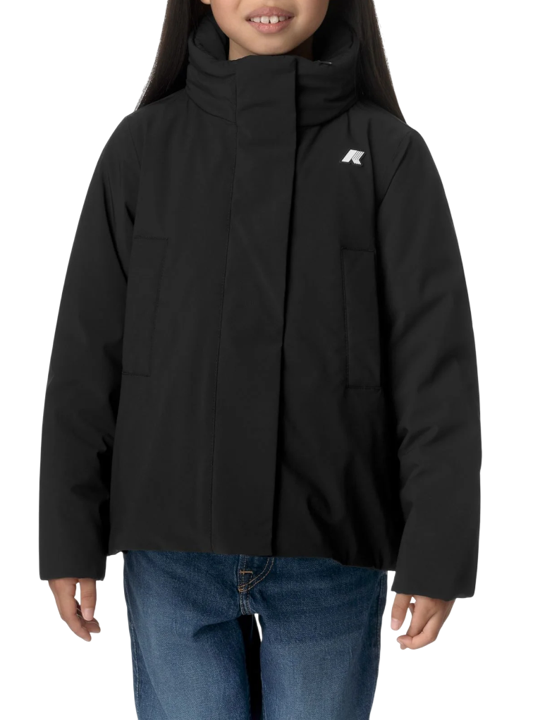 Piumino da bambina realizzato in nylon antivento e impermeabile. Chiusura con zip nascosta da patta richiudibile con bottoni automatici. Patch del logo sul davanti, collo alto. Tasche sul davanti. Spacchi sui lati con bottoni automatici per regolare l'ampiezza del fondo. Imbottitura in ovatta. Tessuto esterno 96% nylon 4% elastan Imbottitura in ovatta