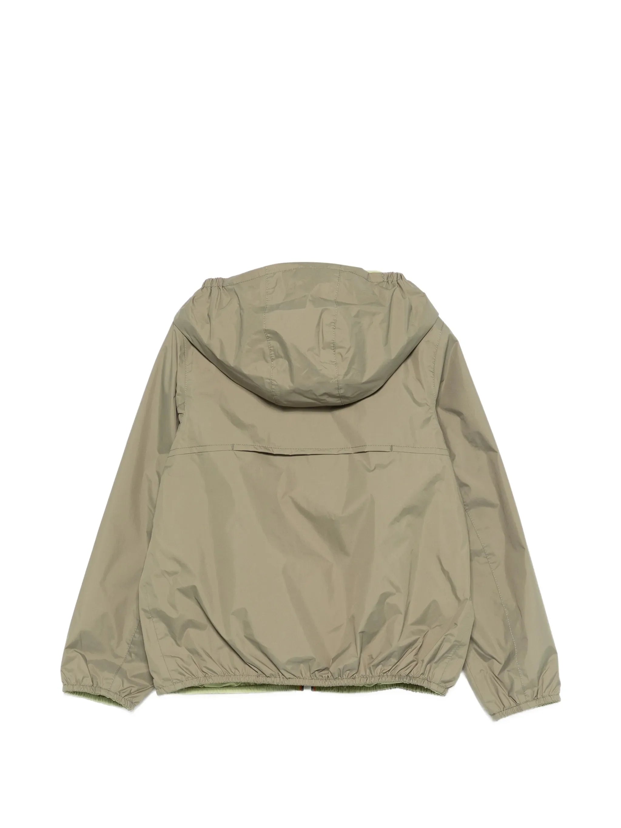 Giubbino leggero antivento realizzato in nylon. Modello reversibile: il lato A è di colore verde salvia, il lato B di colore verde chiaro. Apertura frontale con cerniera, impreziosita da banda nei colori iconici. Cappuccio fisso, tasche con zip nascosta sul davanti. Stampa del logo sul petto. 100% nylon