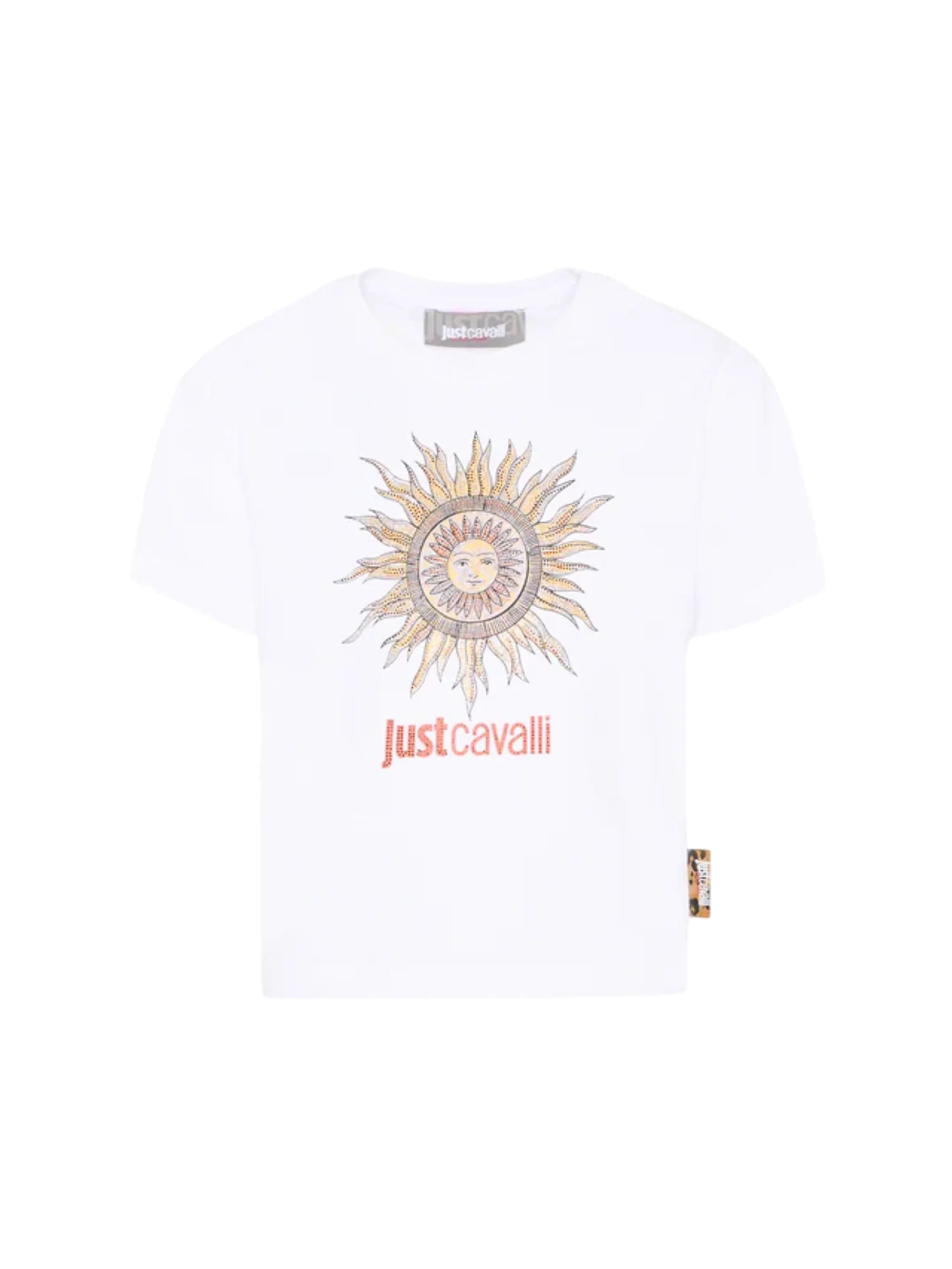 T-shirt da bambina realizzata in jersey di cotone. Maniche corte. Stampa del sole con logo e strass. 100% cotone