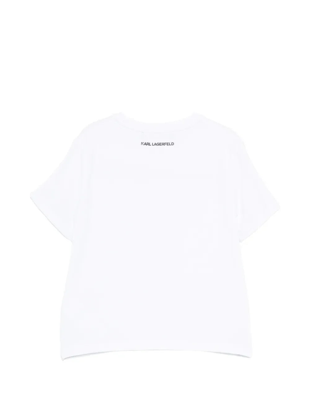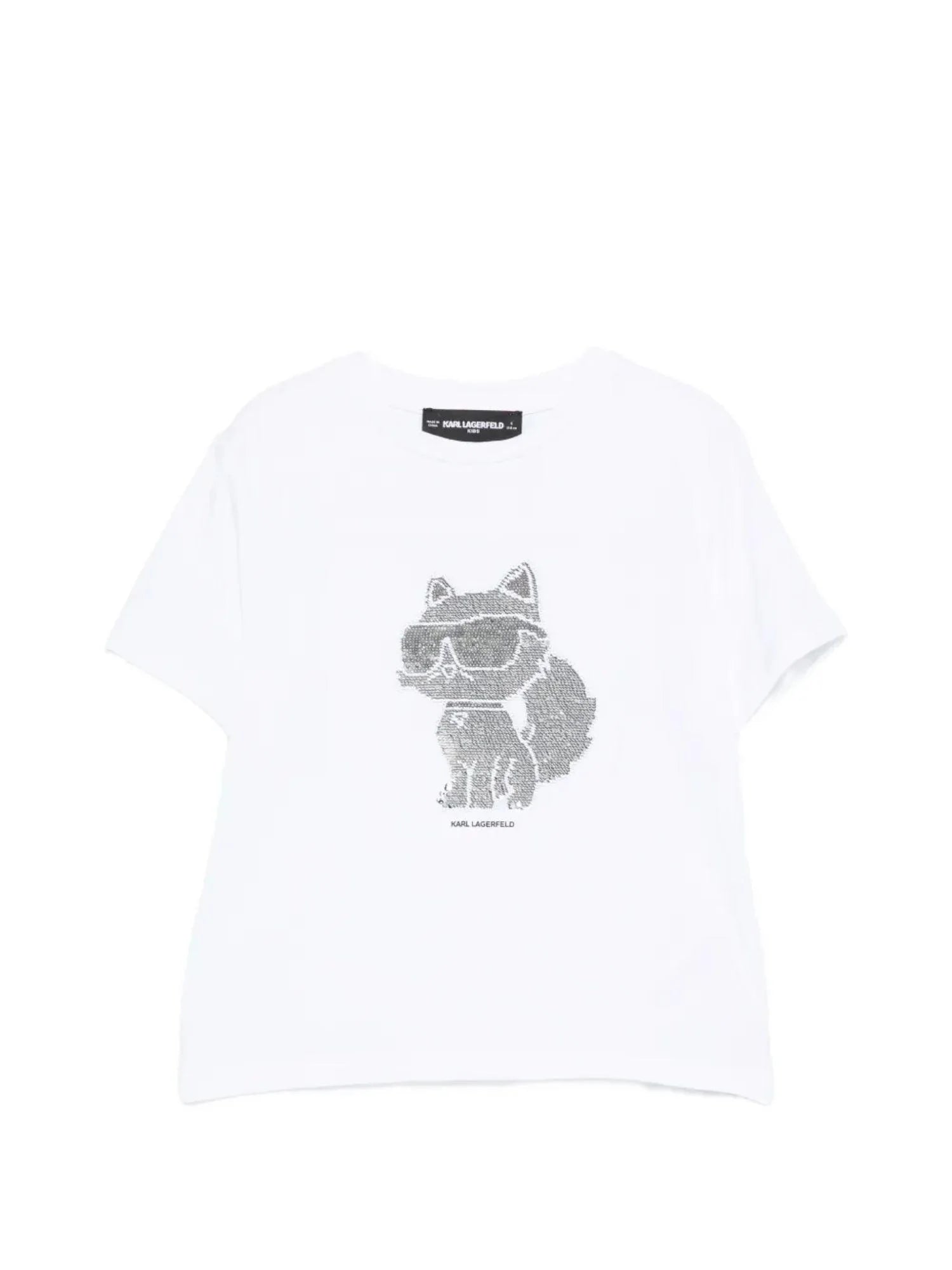 T-shirt da bambina realizzata in jersey. Maniche corte. Disegno iconico di Choupette con paillettes sul davanti. 72% cotone 22% modal 6% elastan