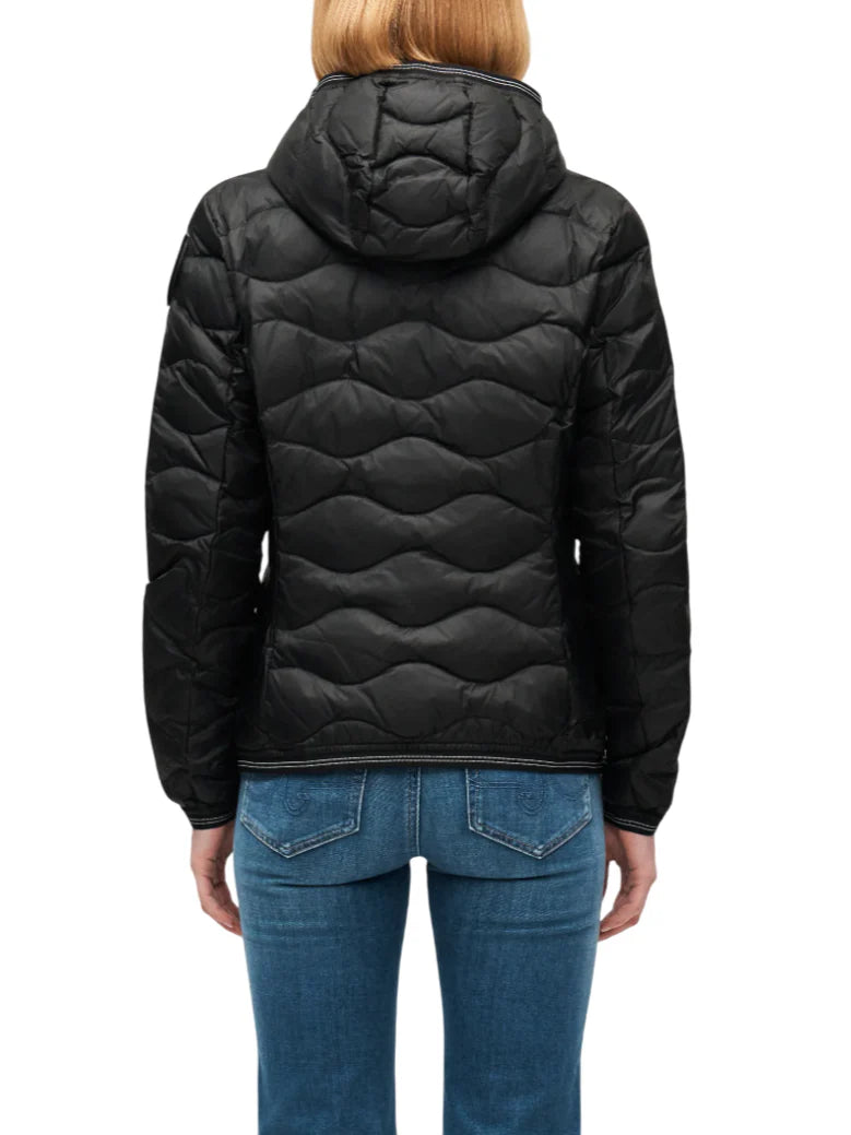 Giubbino imbottito da donna realizzato in nylon trapuntato a onde. Cappuccio fisso. Passante iconico e tasche con zip sul davanti. Patch logato con strass sulla manica. Imbottitura in piuma. Tessuto esterno 100% nylon Imbottitura 90% piumino 10% piuma