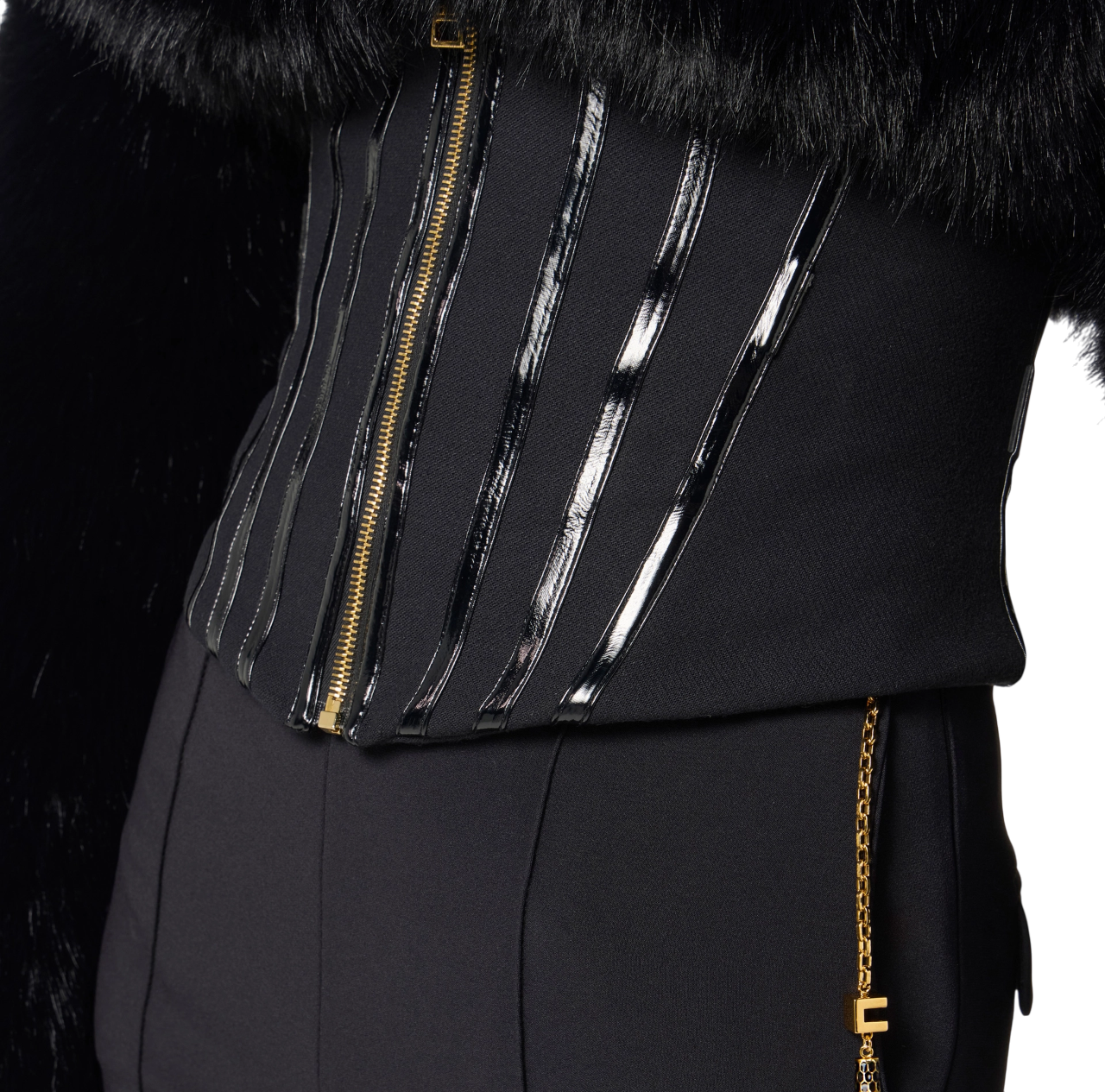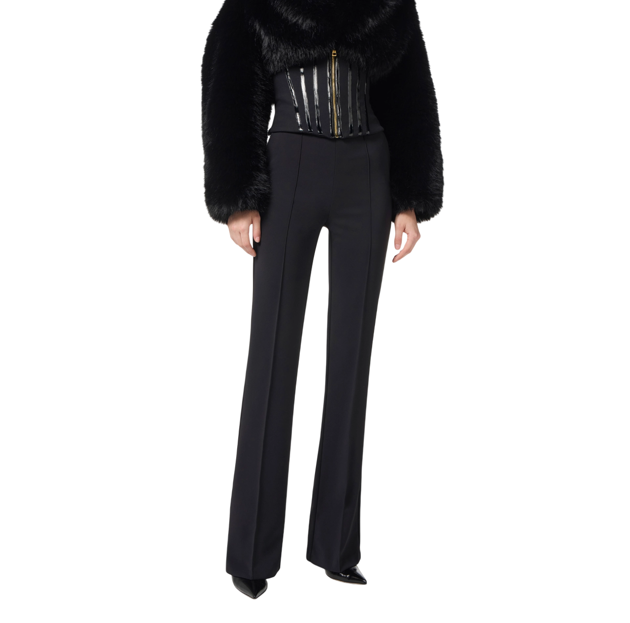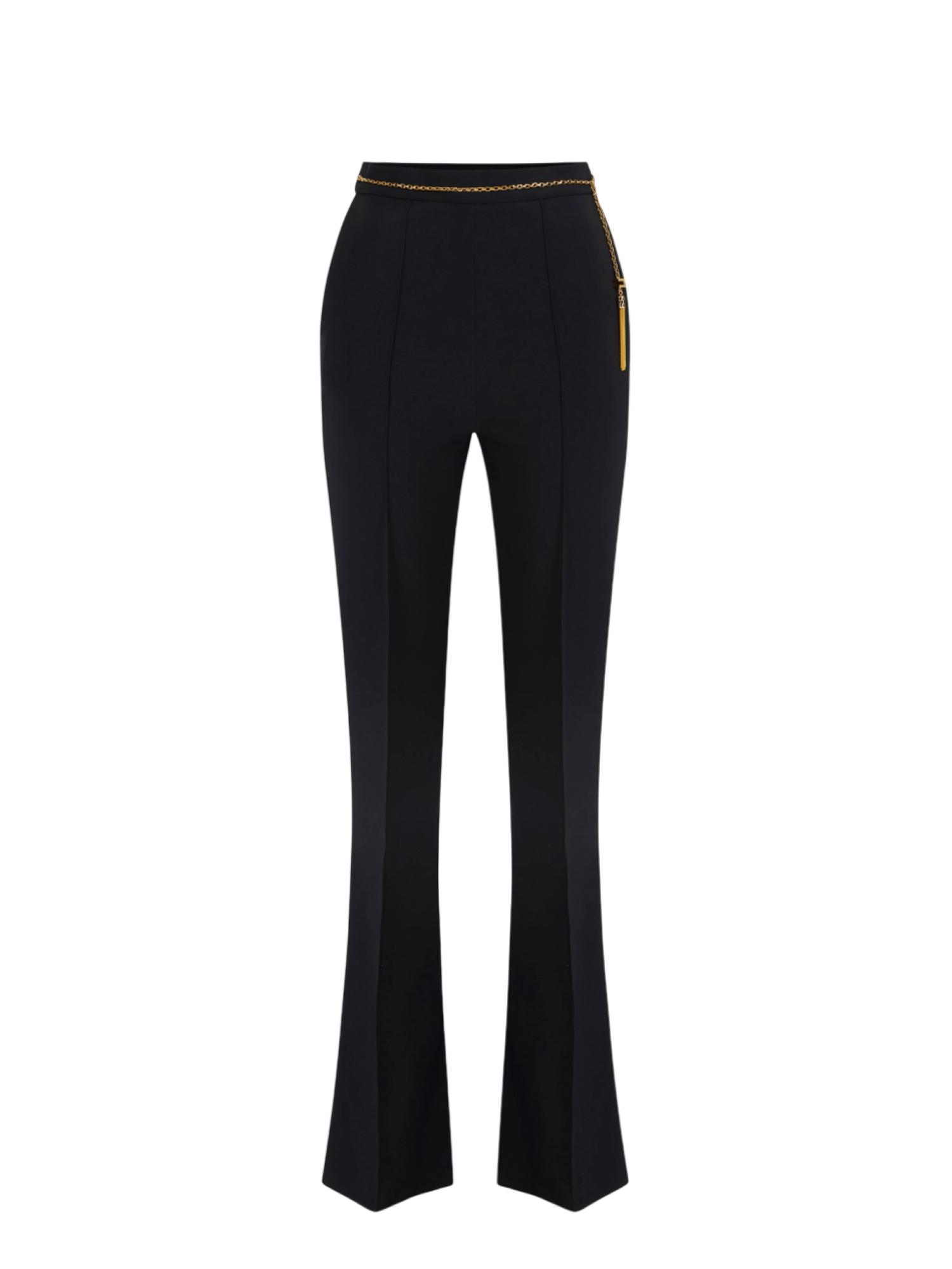 Pantaloni a zampa da donna realizzati in tessuto crepe stretch. Vita alta impreziosita da una catenella dorata rimovibile con dettaglio Snake logato. Tasche con patta sul retro. Vestibilità flare con gamba aderente sulla coscia e più ampia sul fondo. 95% poliestere 5% elastan
