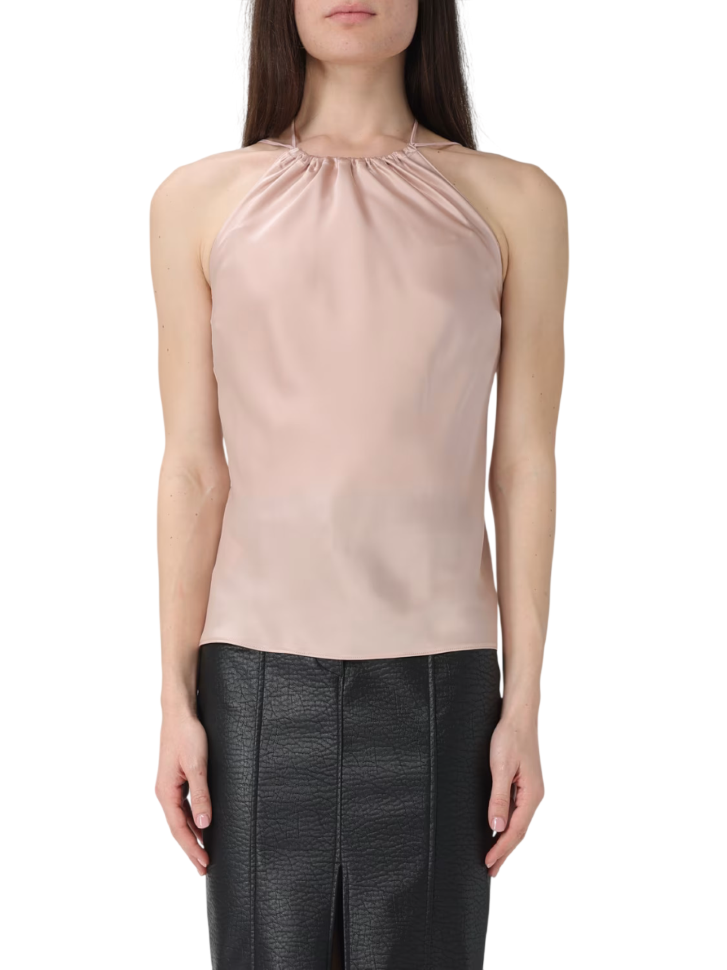 Top all'americana da donna realizzato in tessuto satin. Scollo frontale con coulisse e laccetti da annodare sul retro. Scollo sulla schiena. 91% acetato 9% poliestere