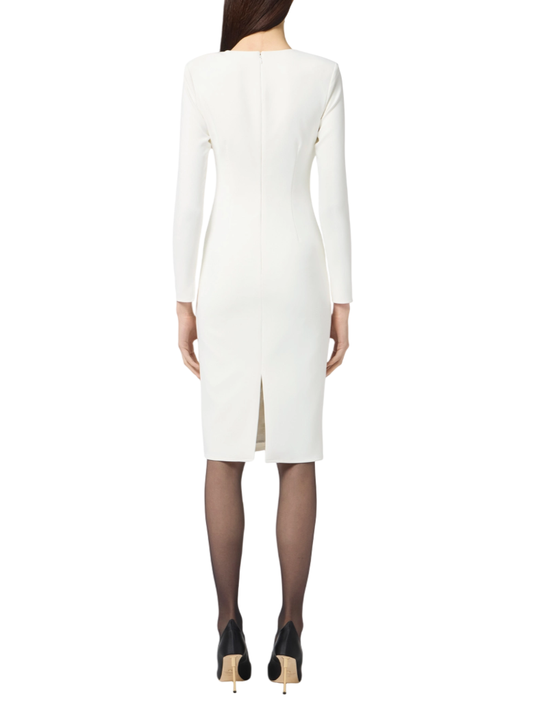 Abito midi da donna realizzato in tessuto crepe. Scollo tondo che si apre a V sul davanti, impreziosito da una catenella in galvanica dorata con dettagli iconici. Spalline leggermente imbottite, maniche lugnhe. Chiusura con cerniera invisibile sul retro. La linea affiancata valorizza la silhouette. 95% poliestere 5% elastan