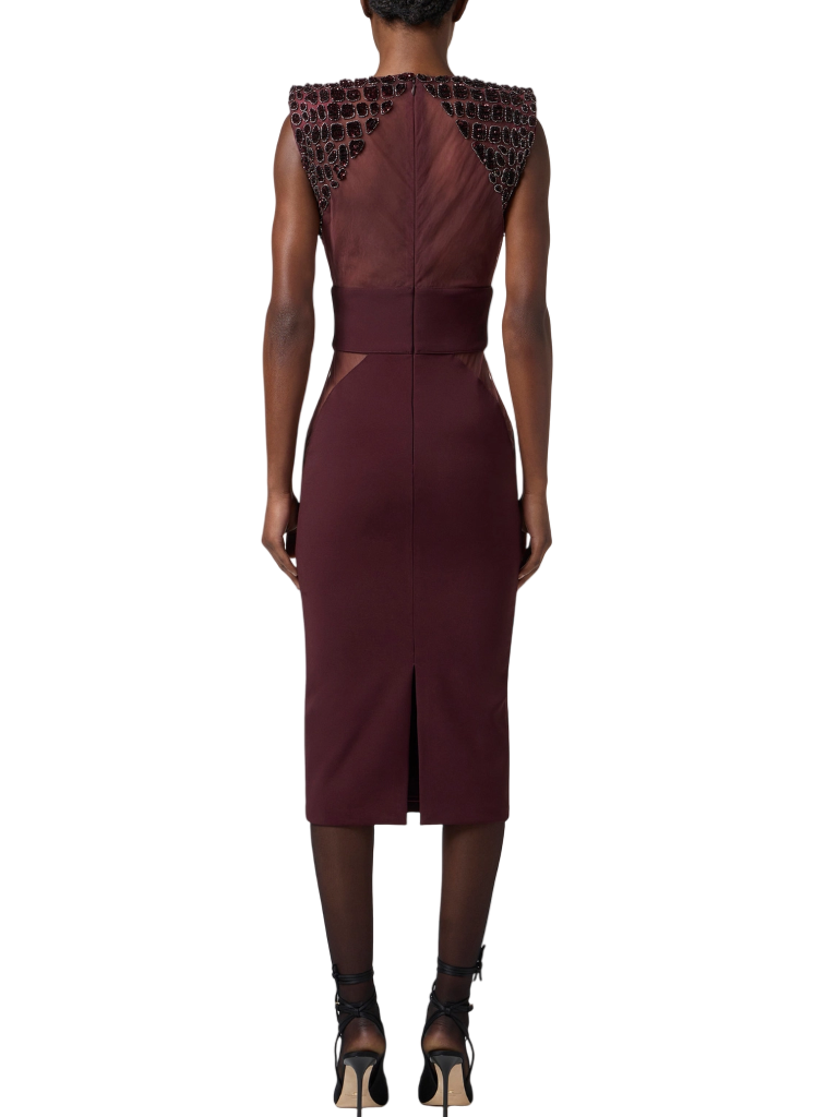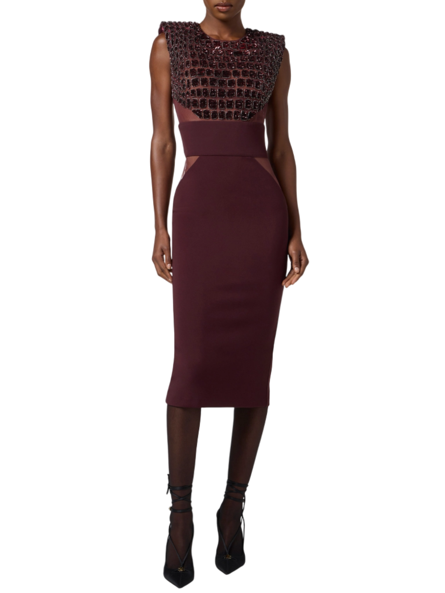 Abito midi da donna caratterizzato da un design bimateriale: il corpino è in tulle ed è impreziosito da ricami con paillettes luminose. Scollo tondo, spalline imbottite, chiusura con cerniera sul retro.Gonna a tubino con aperture cut out sui lati, caratterizzate da inserti in tulle. Spacco centrale sul retro. La linea affiancata esalta la silhouette. 100% poliammide