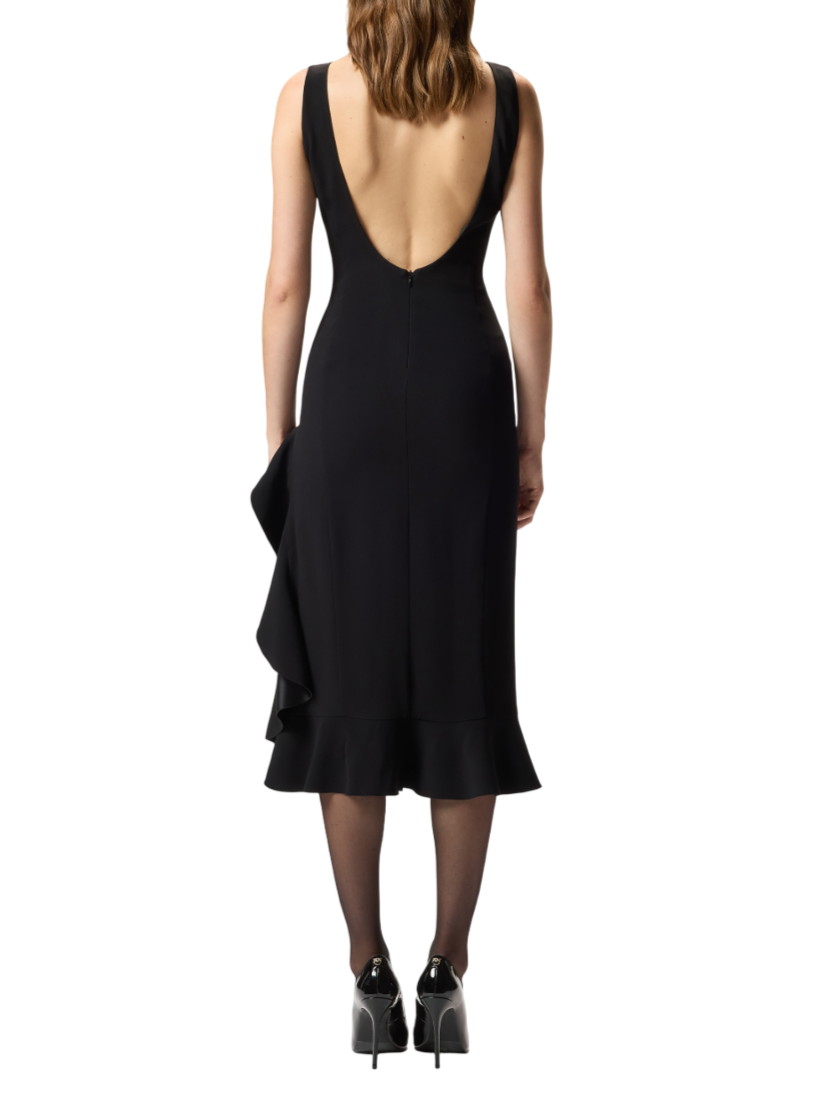 Abito midi da donna realizzato in tessuto crepe dalla linea aderente. Modello smanicato, scollo profondo sulla schiena. Apertura posteriore con zip. Spacco profondo sul davanti impreziosito da volant in raso e tessuto crepe. 98% viscosa 2% elastan