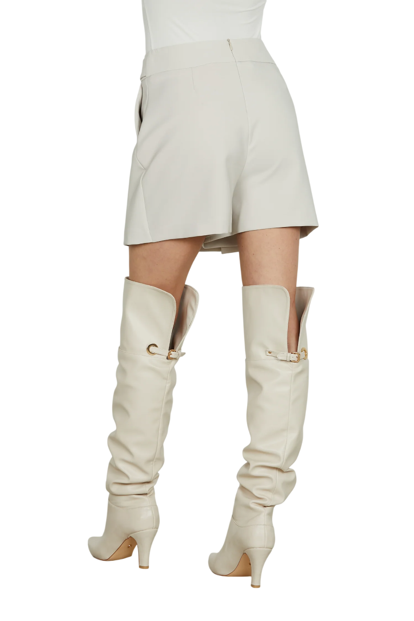 Gonna pantalone corta da donna realizzata in tessuto cady. Bottoni decorativi in galvanica dorata in vita, chiusura zip invisibile sul retro. 88% poliestere 12% elastan