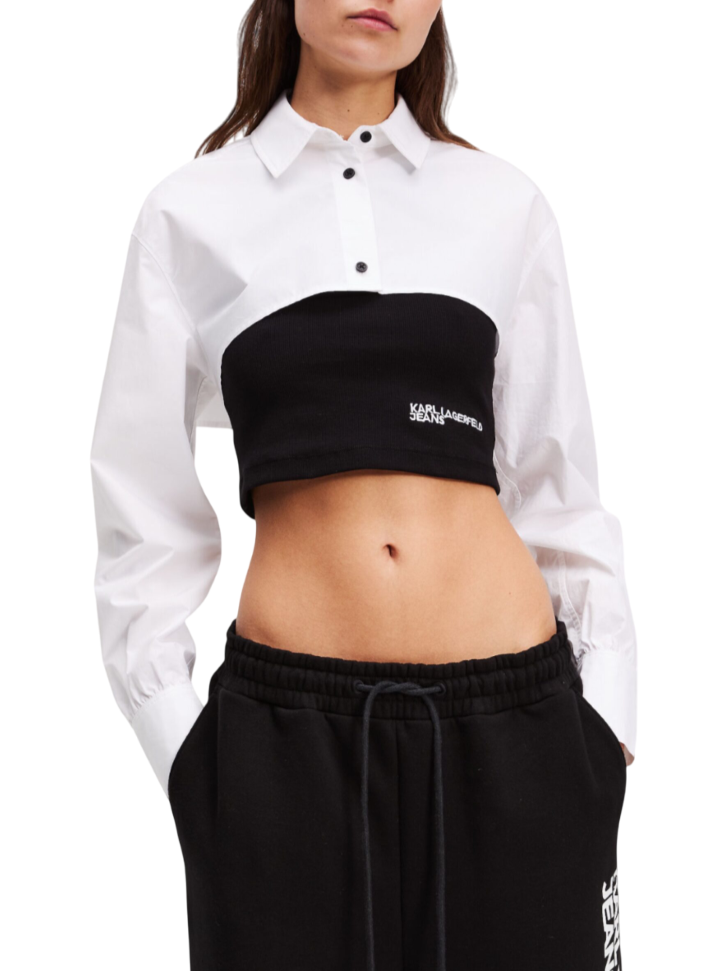 Camicia corta da donna caratterizzata dalla possibilità di utilizzare il capo con due funzioni: come camicia e come top. Top a costine di colore nero con logo ricamato. Camicia corta dal taglio asimmetrico, più corto sul davanti. Colletto classico, maniche lunghe. La camicia e il top sono legati da due bottoncini a pressione nascosti. 100% cotone