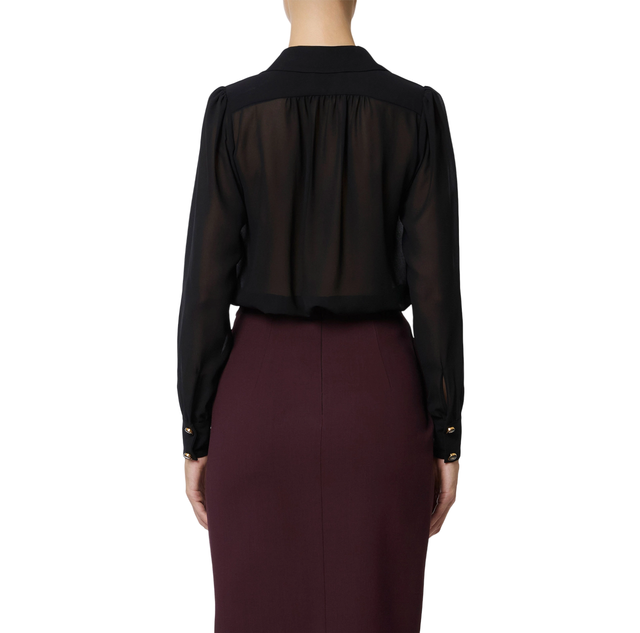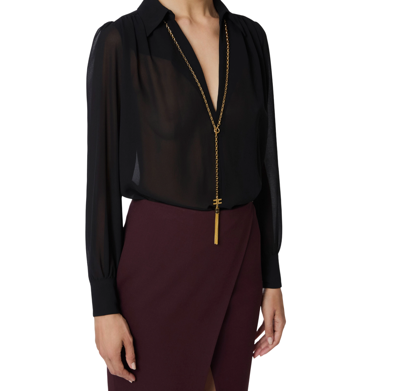 Camicia da donna realizzata in georgette. Colletto classico, scollo a V impreziosito da una catenella in galvanica dorata con dettaglio Snake logato. Maniche lunghe. Abbina questa camicia con trasparenze ad un pantalone a zampa o ad una gonna corta per un look audace e femminile. 100% poliestere