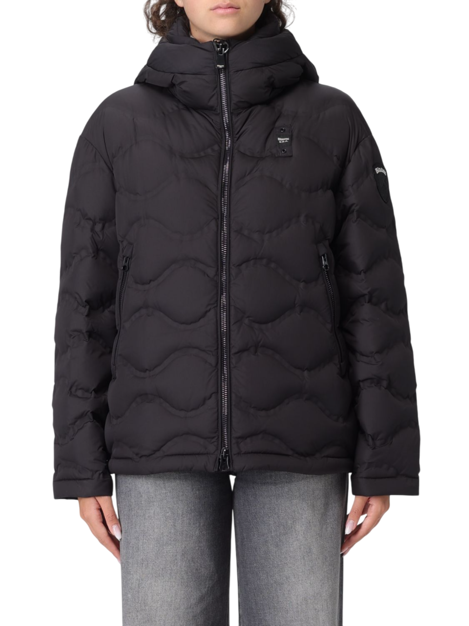 Piumino da donna realizzato in tela tecnica con trapuntatura a onde. Cappuccio fisso con coulisse, apertura frontale con cerniera. Passante iconico, patch scudo. Tasche con zip sul davanti. Imbottitura in piumino. Tessuto esterno 100% poliestere Imbottitura 100% piumino