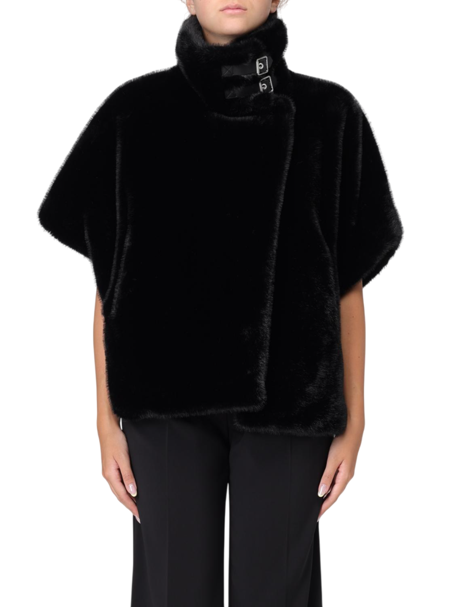 Cappa da donna realizzata in morbida pelliccia ecologica. Collo alto con fibbie in ecopelle martellata, maniche corte. Apertura con bottoni automatici nascosti sulla parte superiore. Spacchetti laterali sul fondo caratterizzati da fibbie in ecopelle. Questo capospalla è perfetto per la stagione invernale: caldo, versatile e di tendenza. 100% poliestere