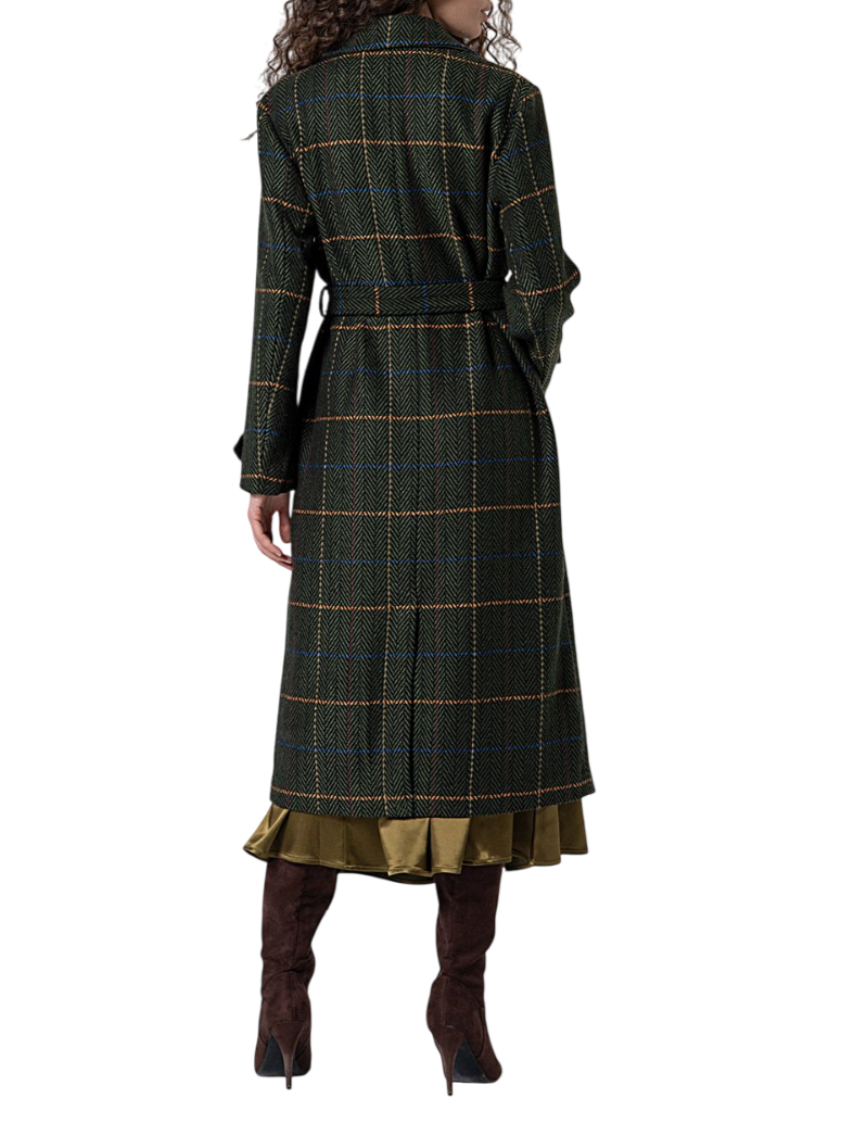 Cappotto lungo da donna realizzato in misto lana. Fantasia scozzese con trama spigata. Abbottonatura doppiopetto, collo con revers. Tasche sul davanti, cintura in vita. 70% poliestere 25% lana 5% acrilico