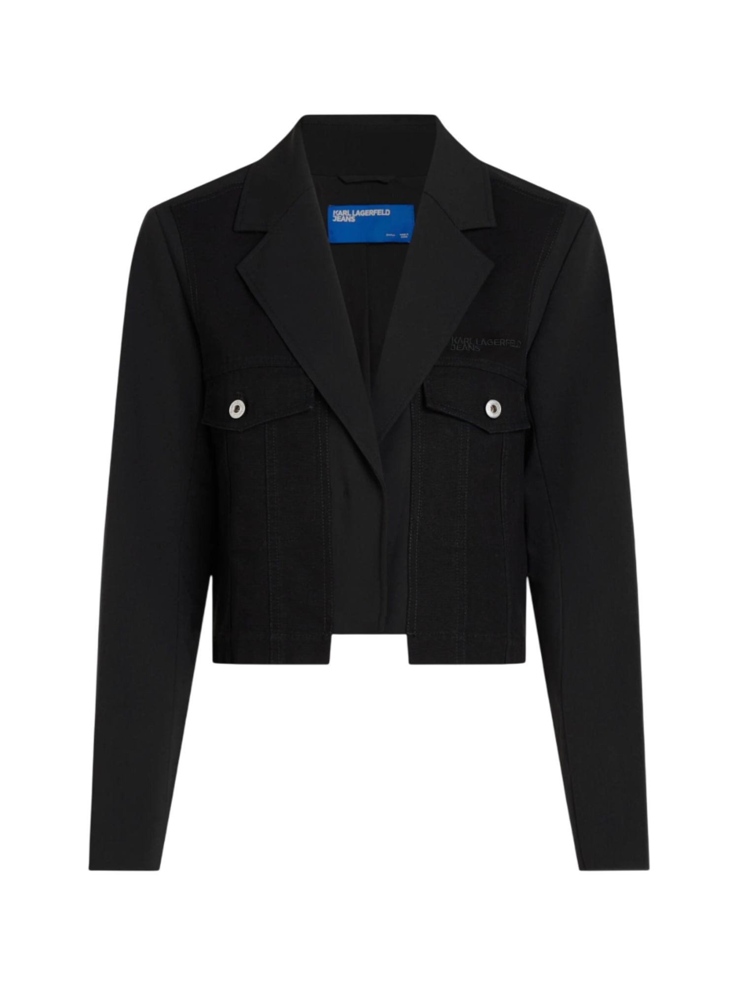 Giacca stile blazer da donna caratterizzata da un design bimateriale. Collo con revers, ricamo del logo sul davanti. Tasche con patta. Le maniche e il collo sono realizzati in tessuto misto viscosa, il davanti e il retro sono in denim. 67% poliestere 28% poliestere 2% elastan
