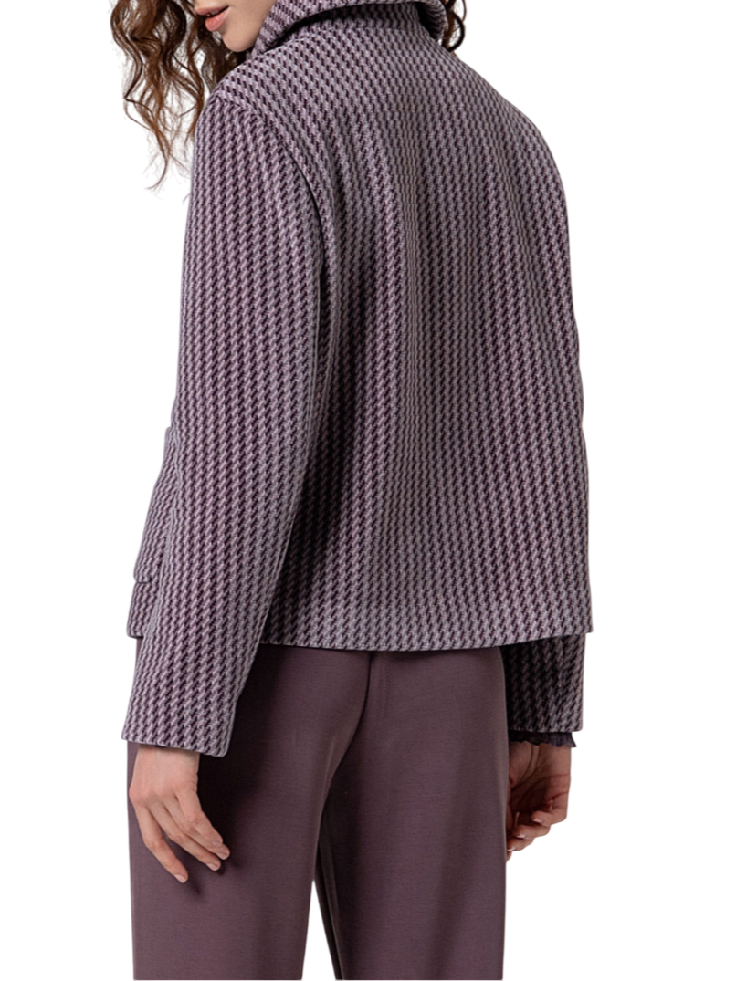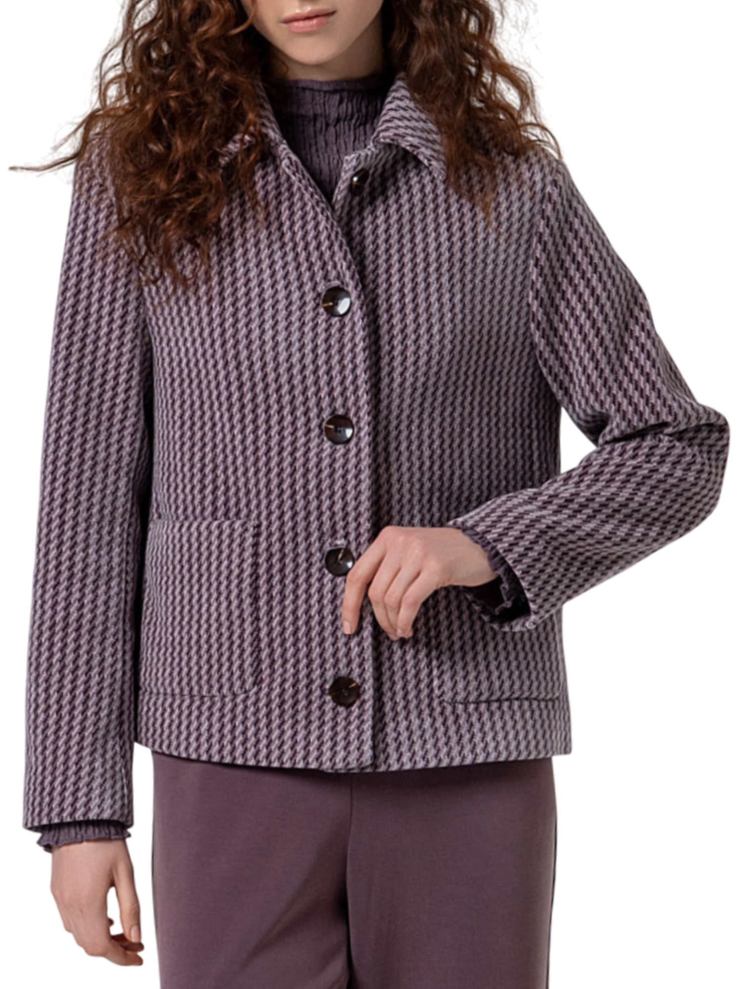 Giacca da donna realizzata in panno con fantasia jacquard. Colletto classico, apertura frontale con bottoni. Tasche aperte sul davanti. 100% poliestere