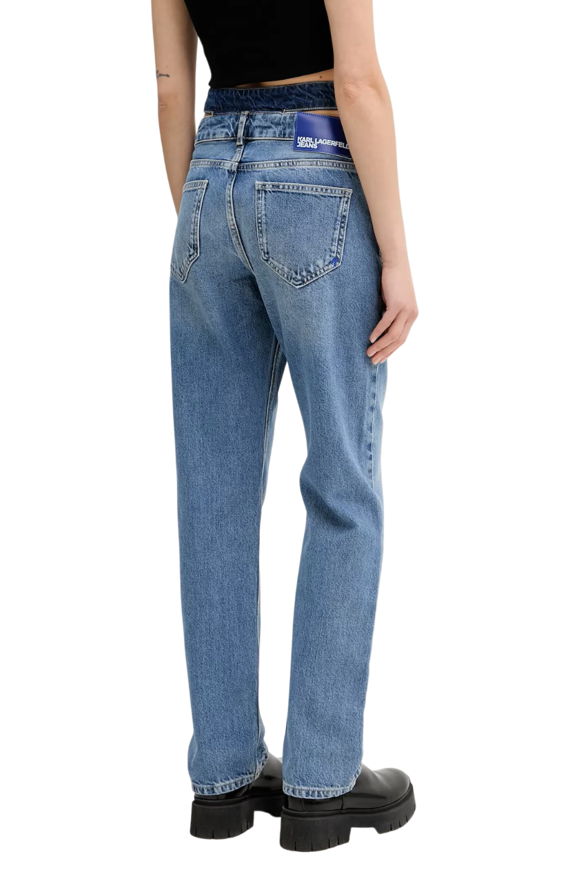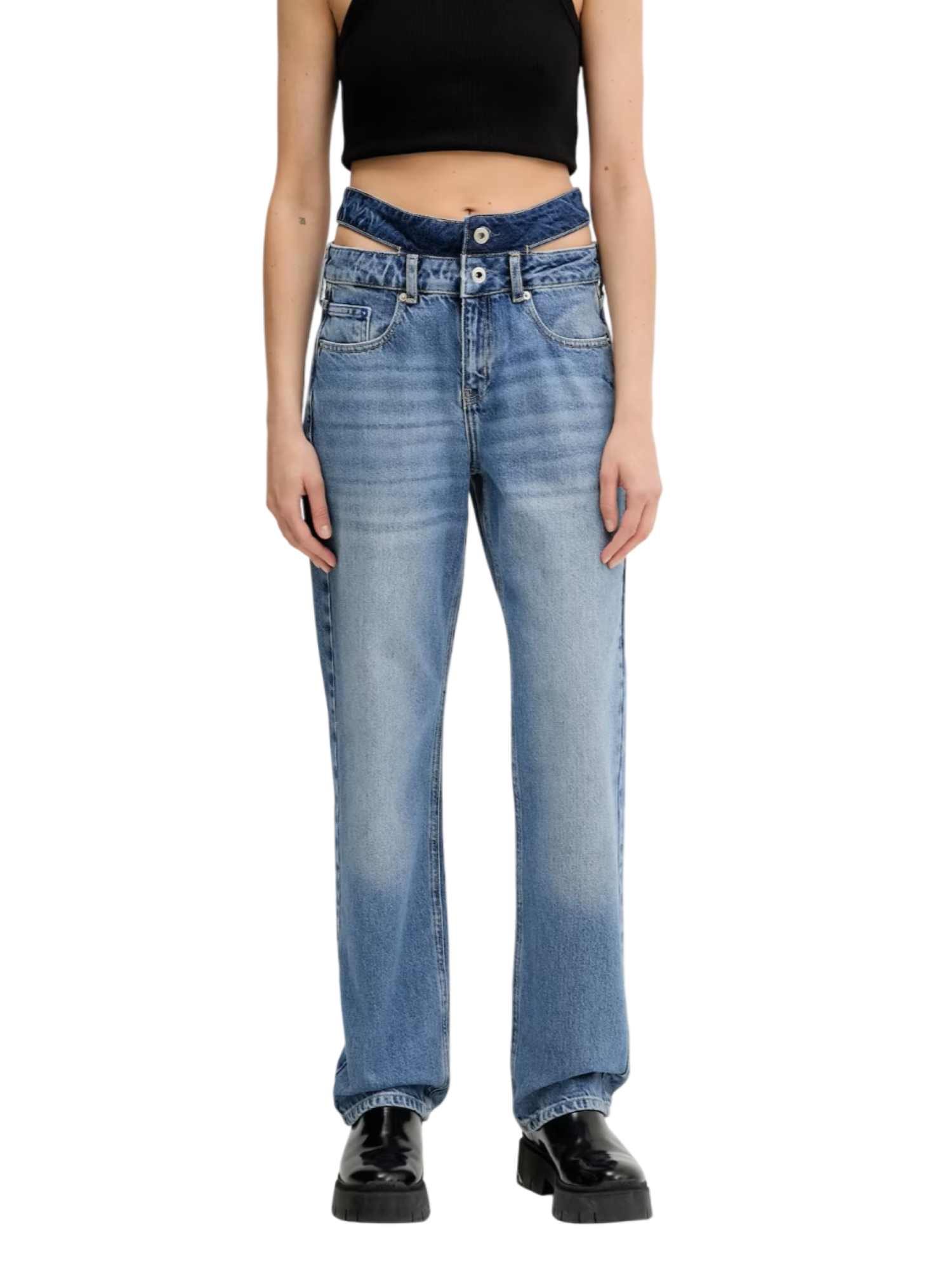 Jeans da donna realizzati in denim di cotone rigido. Aperture cut out in vita. Modello 5 tasche, vita alta. gamba dritta. 100% cotone