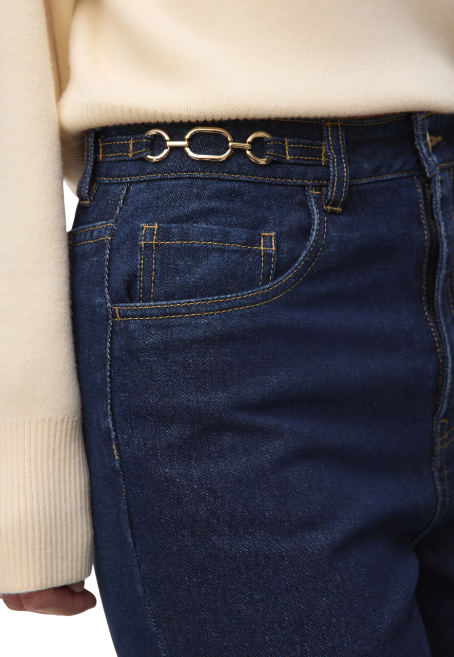 Jeans da donna realizzati in denim rigido. Vita alta impreziosita da applicazioni metalliche color oro. Vita alta, gamba larga.