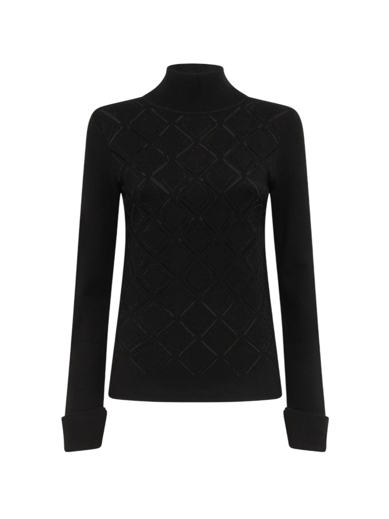 Maglia a lupetto da donna realizzata in misto viscosa. Il davanti è caratterizzato da una trama a rombi con piccoli strass luminosi. Collo leggermente alto. 62% viscosa 38% poliestere