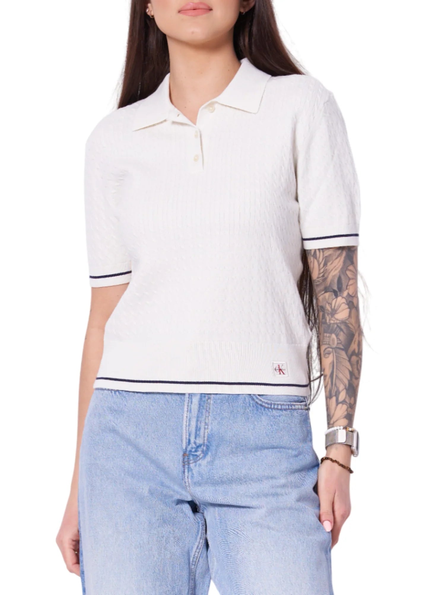 Polo da donna in maglia con trama a trecce. Aperture con tre bottoncini, maniche corte. Profili in contrasto sul fondo e sulle maniche. Patch logato sul fondo. 86% cotone 13% poliammide 1% elastan