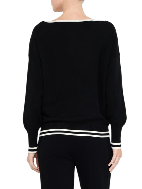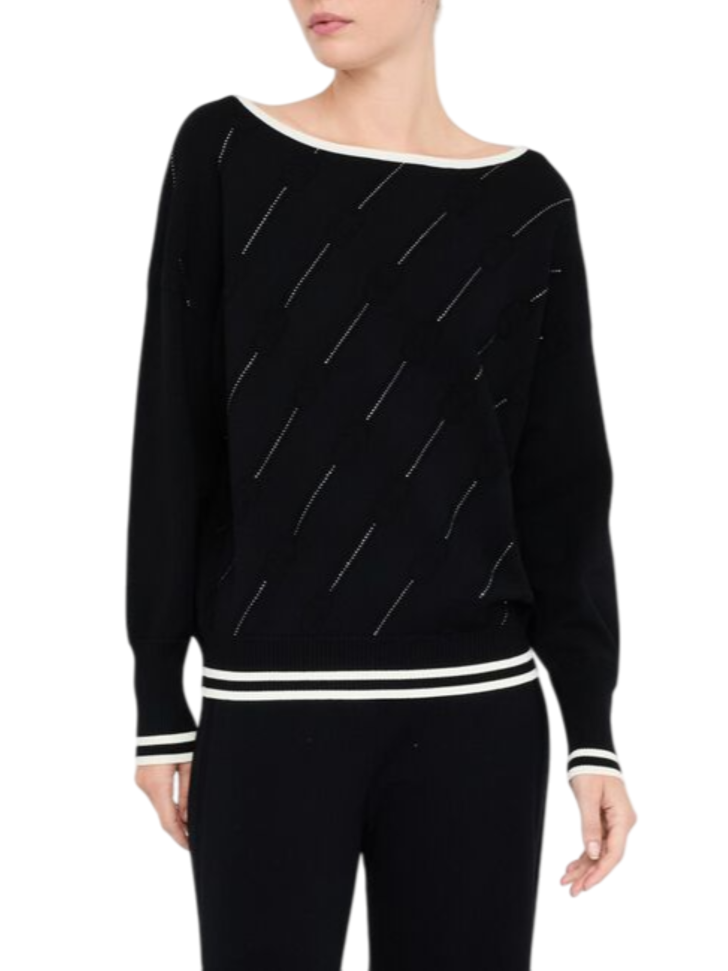Maglia da donna realizzata in misto viscosa. Scollo a barchetta. Inserto jacquard su scollo, polsini e fondo in contrasto di colore. Il davanti è caratterizzato da una trama con logo monogram jacquard e da strass. 62% viscosa 38% poliestere