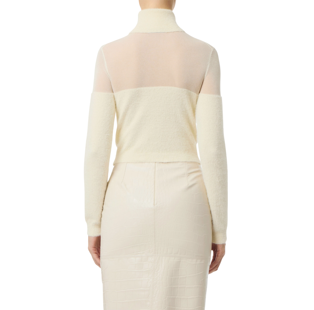 Maglia dolcevita da donna caratterizzata da una texture effetto pelo fluffy. Collo alto, maniche lunghe. Lo scollo e la parte superiore della schiena sono in tulle con trasparenze che crea l'effetto di uno scollo a fascia. Dettaglio logato con strass sul davanti. 83% poliammide 17% cotone