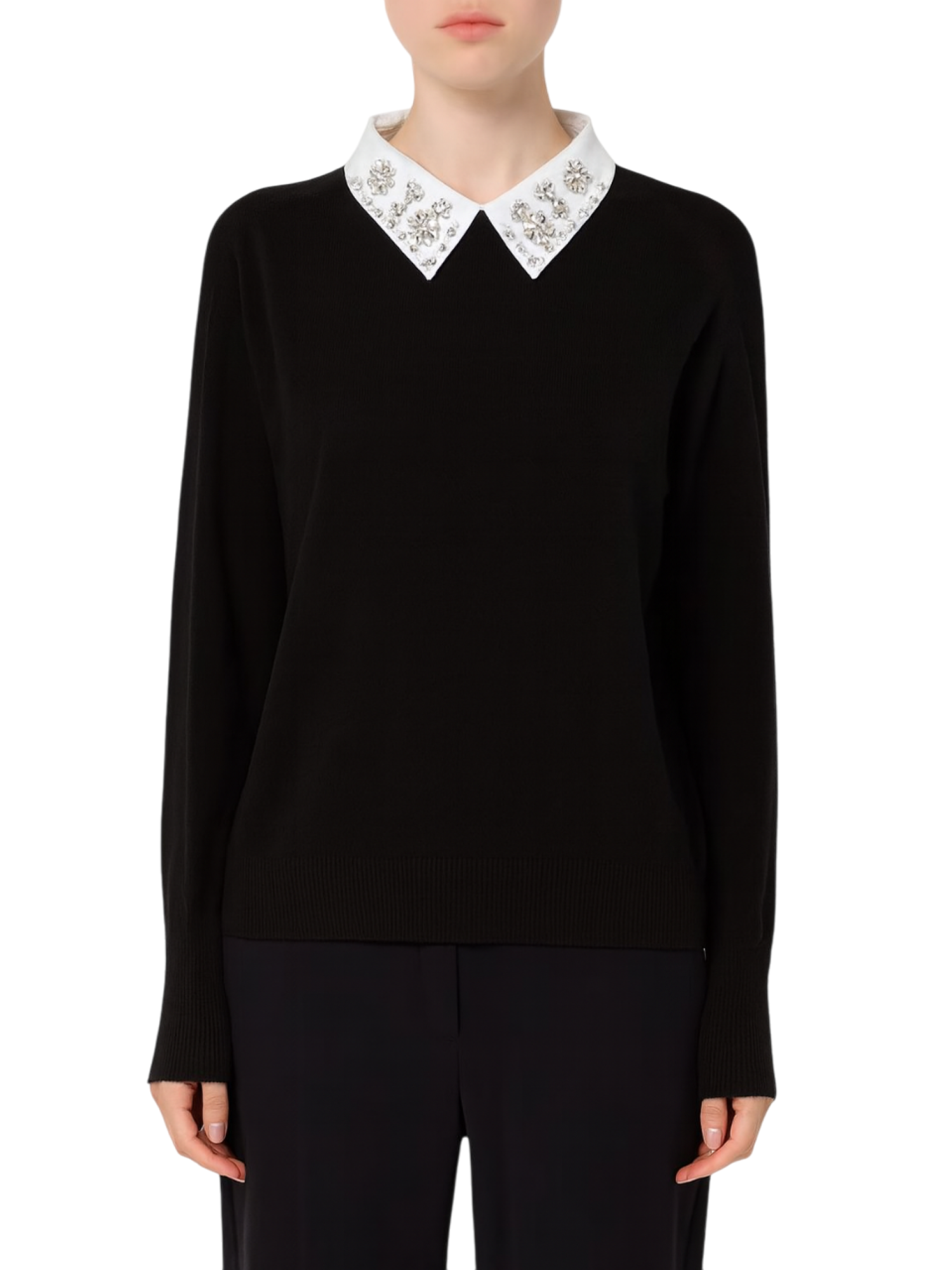 Maglia da donna realizzata in misto viscosa. Lo scollo tondo è impreziosito da un colletto rimovibile con applicazioni gioiello. 50% viscosa 27% poliestere 23% poliammide