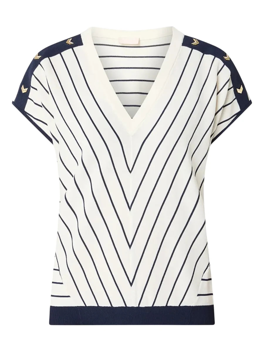 Maglia da donna in misto viscosa a righe. Scollo a V, maniche corte. Bande con dettagli gioiello color oro sulle spalle. 65% viscosa 35% poliammide