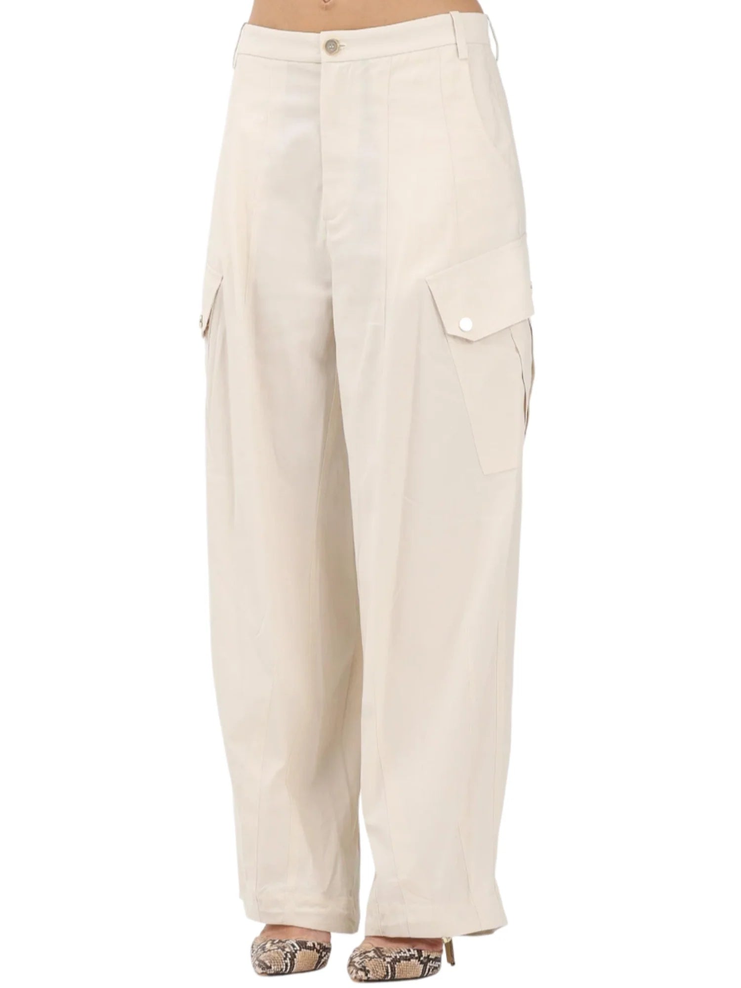 Pantaloni cargo da donna realizzati in gabardina di cotone. Vita alta con passanti, tasconi laterali con patta. Tasche alla francese sul davanti. Tasche sul retro. Gamba larga, coulisse interne sul fondo delle gambe. 100% cotone