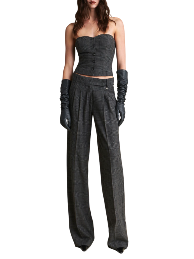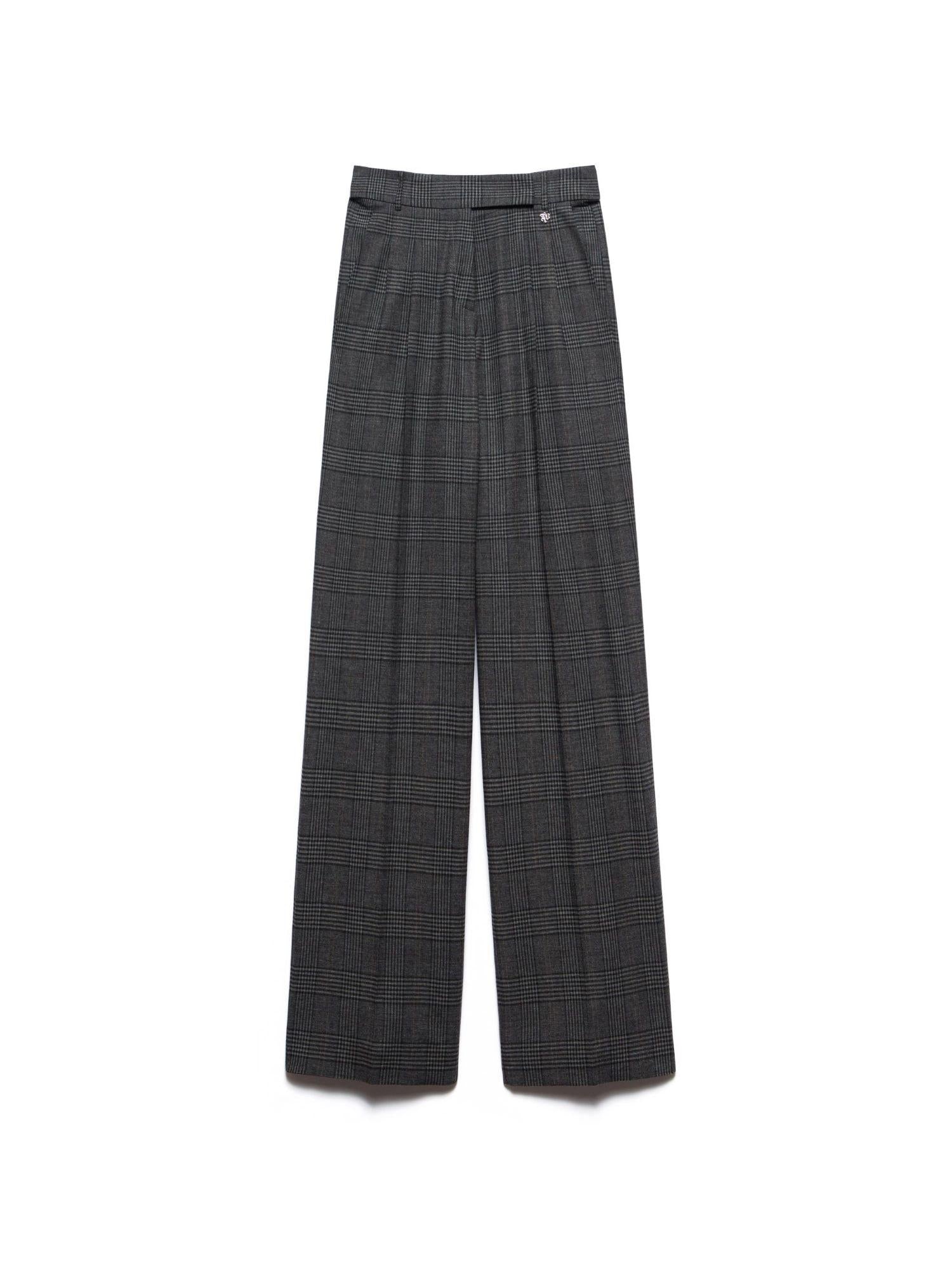 Pantaloni da donna realizzato in tessuto misto viscosa con stampa check. Pinces sul davanti, vita media con passanti. Gamba larga. 82% viscosa 18% poliestere