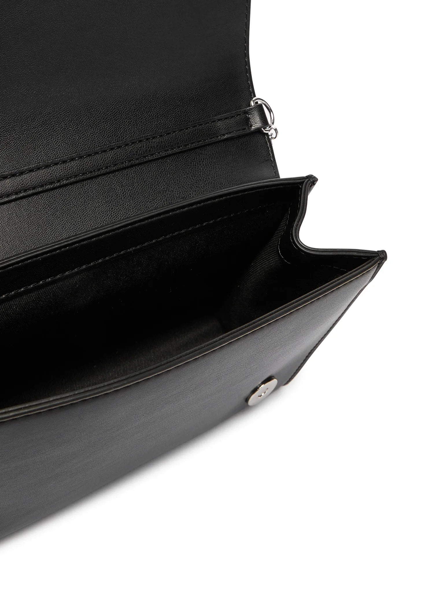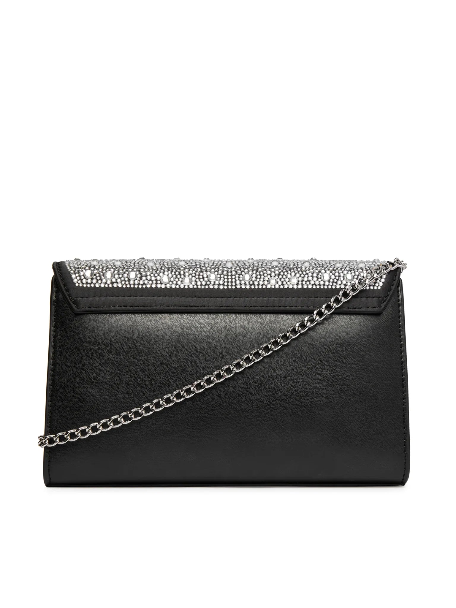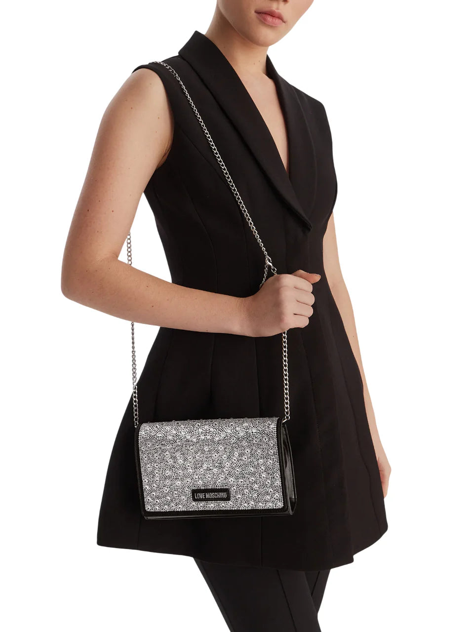 Borsa a tracolla da donna realizzata in ecopelle e interamente impreziosita da applicazioni gioiello luminose sul davanti. Patch con placca del logo color argento sul davanti. Tracolla con catenella metallica argento. Misure: 22x14x6 cm 100% poliuretano