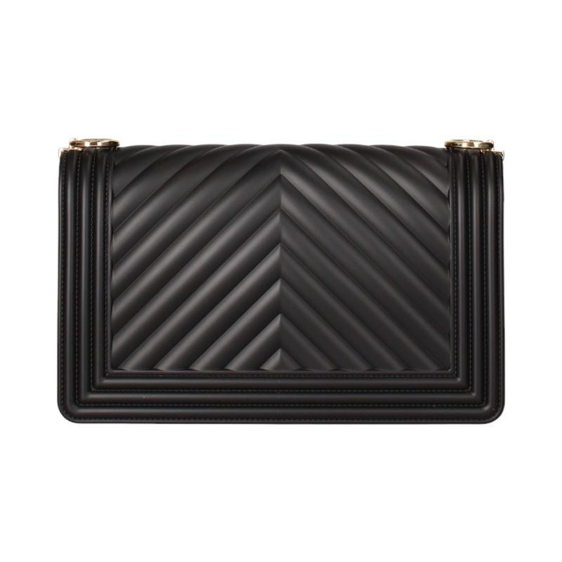 Borsa da donna realizzata in gomma trapuntata. Manico con catena metallica oro, tracolla rimovibile in canetè tono su tono con logo jacquard. Chiusura con patta e bottone mangnetico nascosto. Placca con logo color oro sul davanti. Scomparto interno unico. Misure: 25x14x8 cm