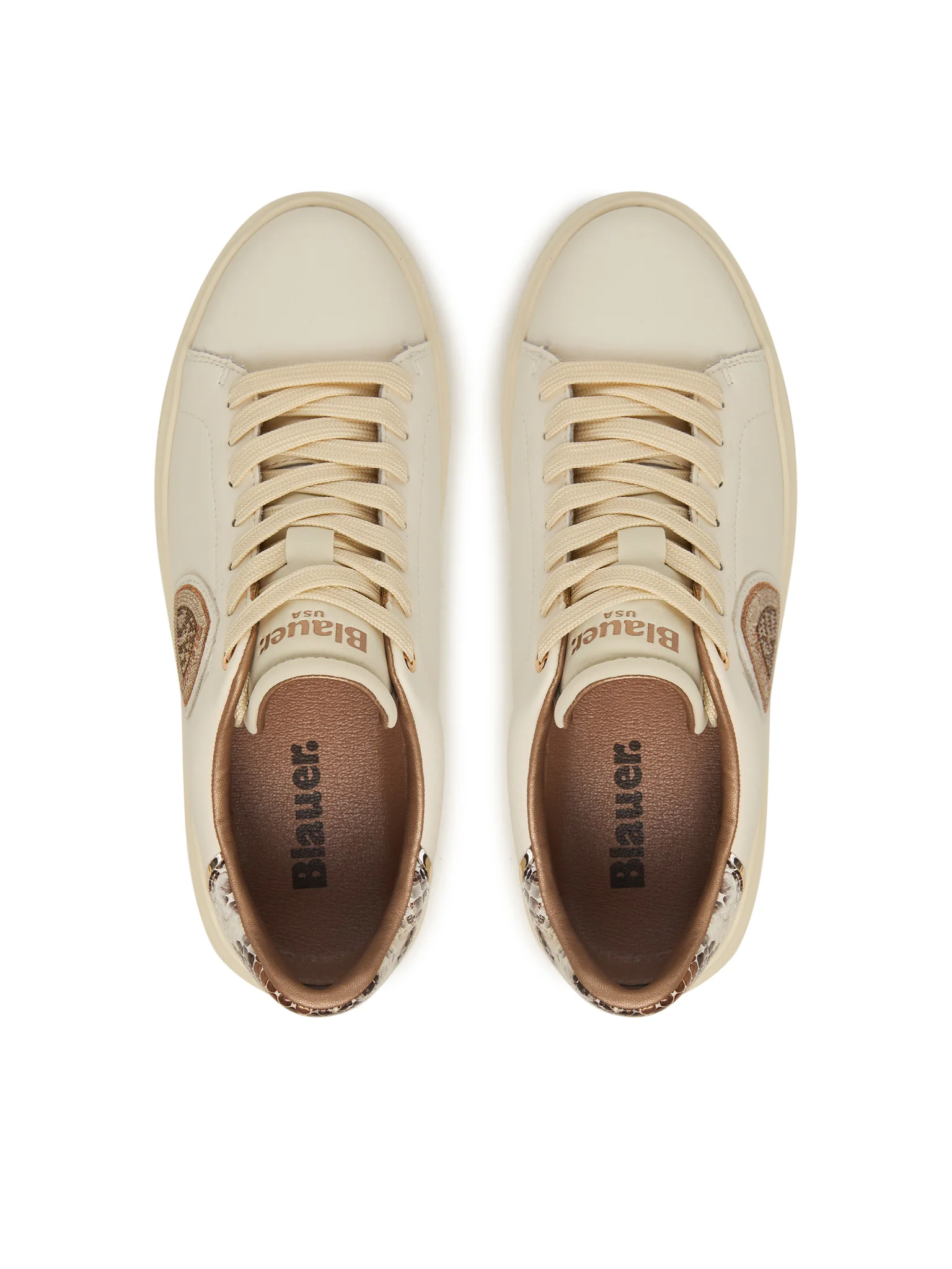 Sneakers da donna realizzate in pelle. Inserto in fantasia pitonata sul retro, patch logato con strass sul lato esterno. Allacciatura con stringhe. Tomaia in pelle ed ecopelle Suola in gomma