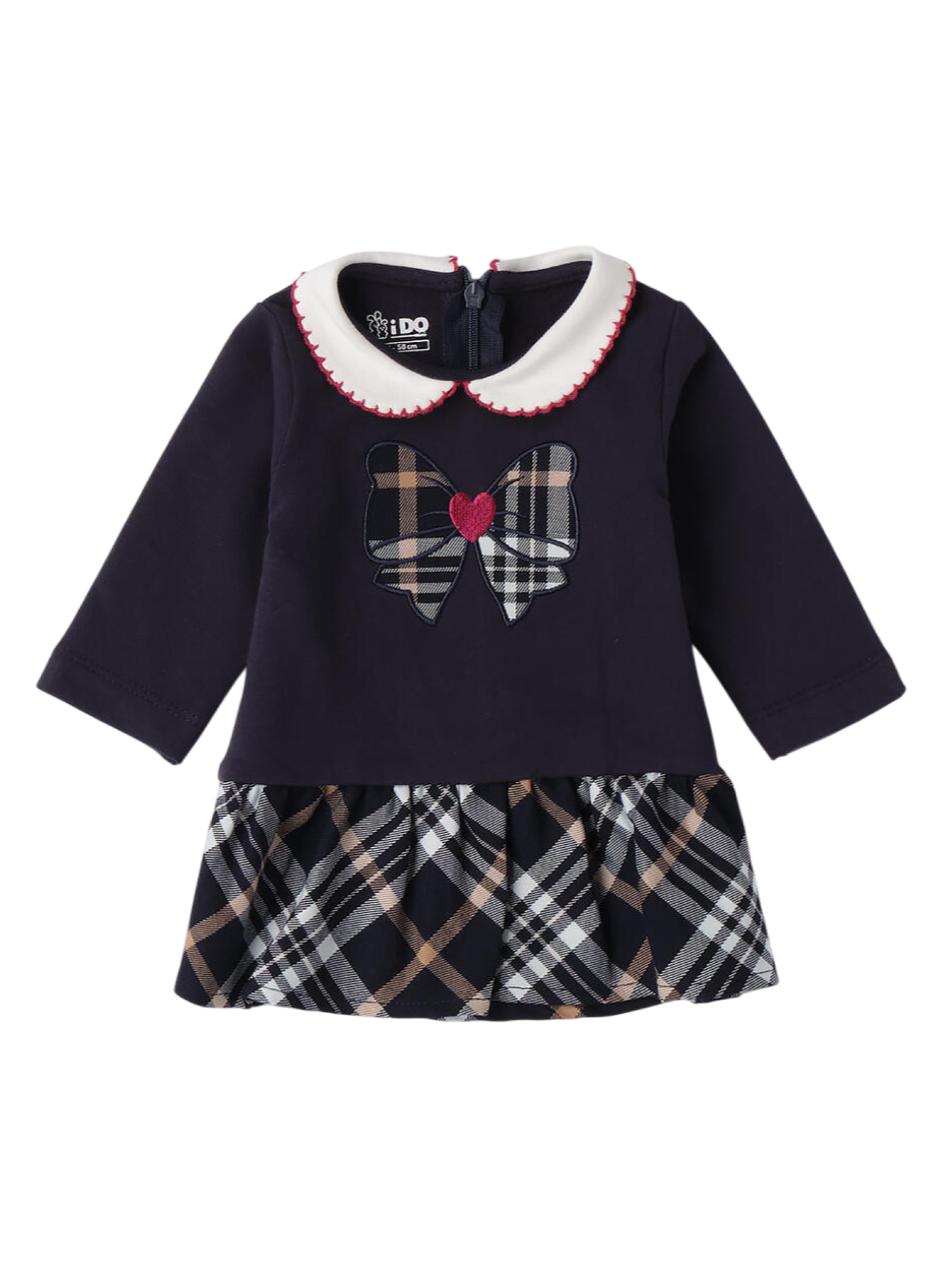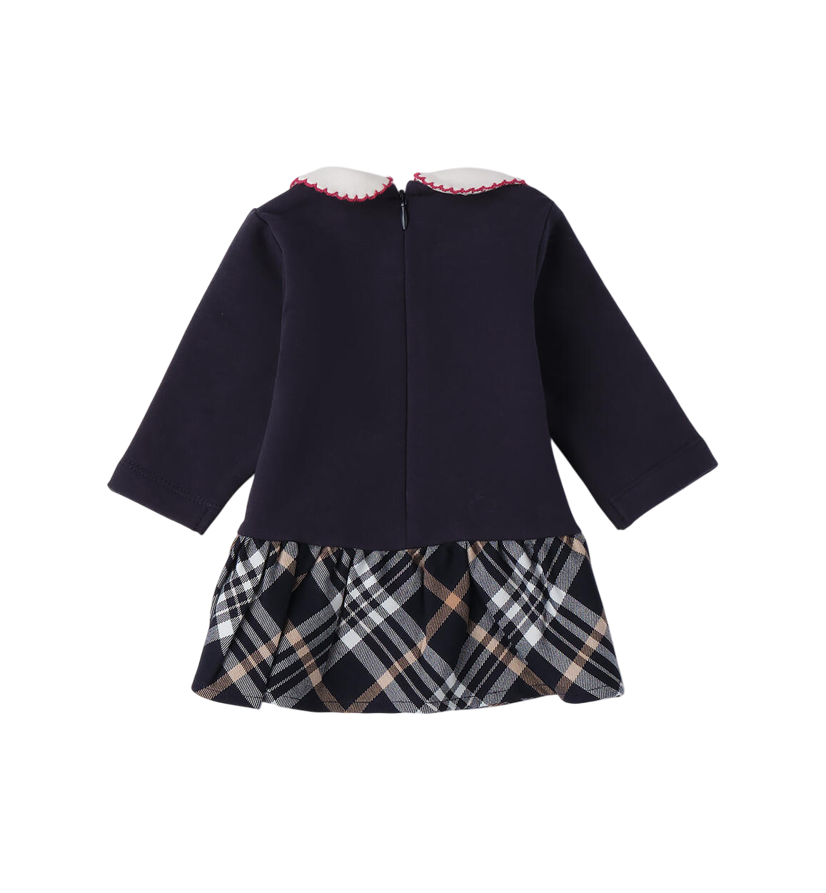 Abito da neonata realizzato in felpa. Gonna in fantasia scozzese. Colletto stondato, maniche lunghe.