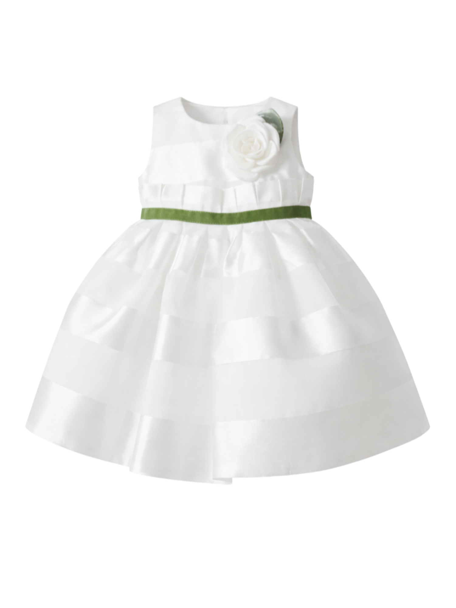 Abito elegante da neonata perfetto per una cerimonia o un evento speciale come il Battesimo o il primo compleanno. Il vestito presenta un design a blocchi di materiale con parti in mikado e parti in organza trasparente. Nastrino in vita di colore verde impreziosito da rouches. Applicazione a forma di fiore sul davanti. Chiusura posteriore con cerniera invisibile. Gonna vaporosa con strati interni in tulle. Tessuto principale 50% seta 50% acrilico