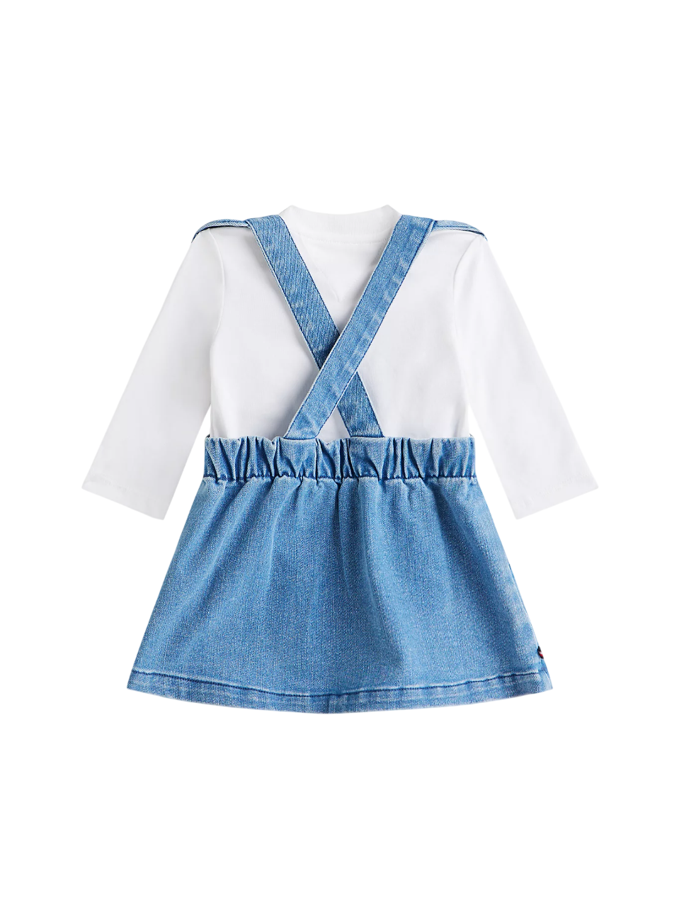 Abito da bambina stile salopette in denim. T-shirt manica lunga in jersey di cotone. Salopette di jeans con tasca frontale impreziosita da bandierina iconica. 76% cotone 23% poliestere 1% elastan