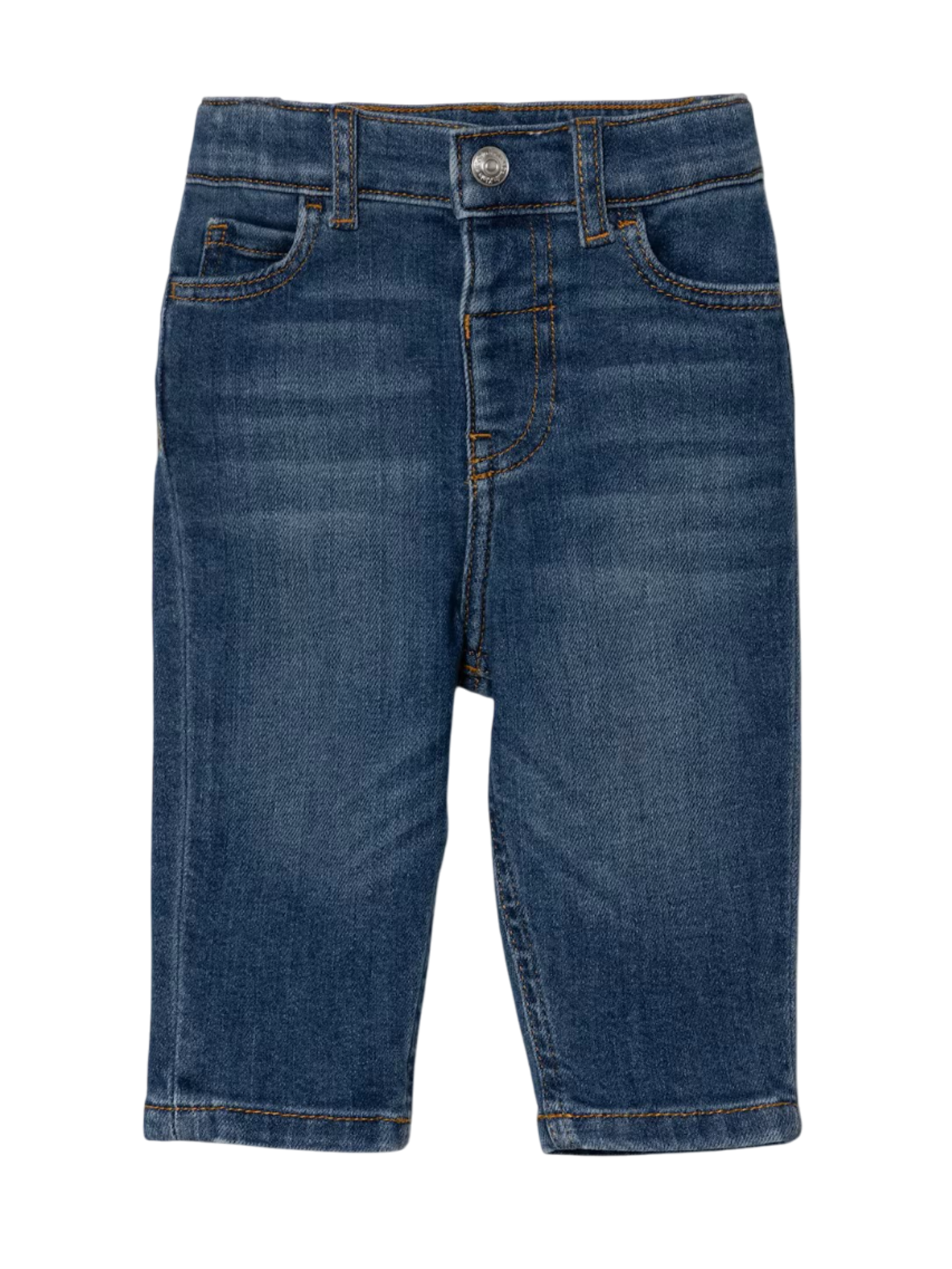 Jeans da neonato realizzati in denim di cotone stretch effetto used. Vita elasticizzata con passanti, gamba slim. 99% cotone 1% elastan