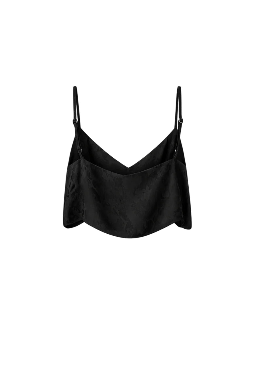Top corto in tessuto misto modal con trama floreale jacquard tono su tono. Vestibilità cropped. Bretelline regolabili. 58% viscosa 42% modal