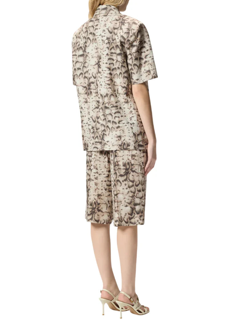Giacca stile blazer da donna realizzata in lino con stampa pitonata. Maniche corte, collo con revers, spalline imbottite. Abbottonatura monopetto. 100% lino