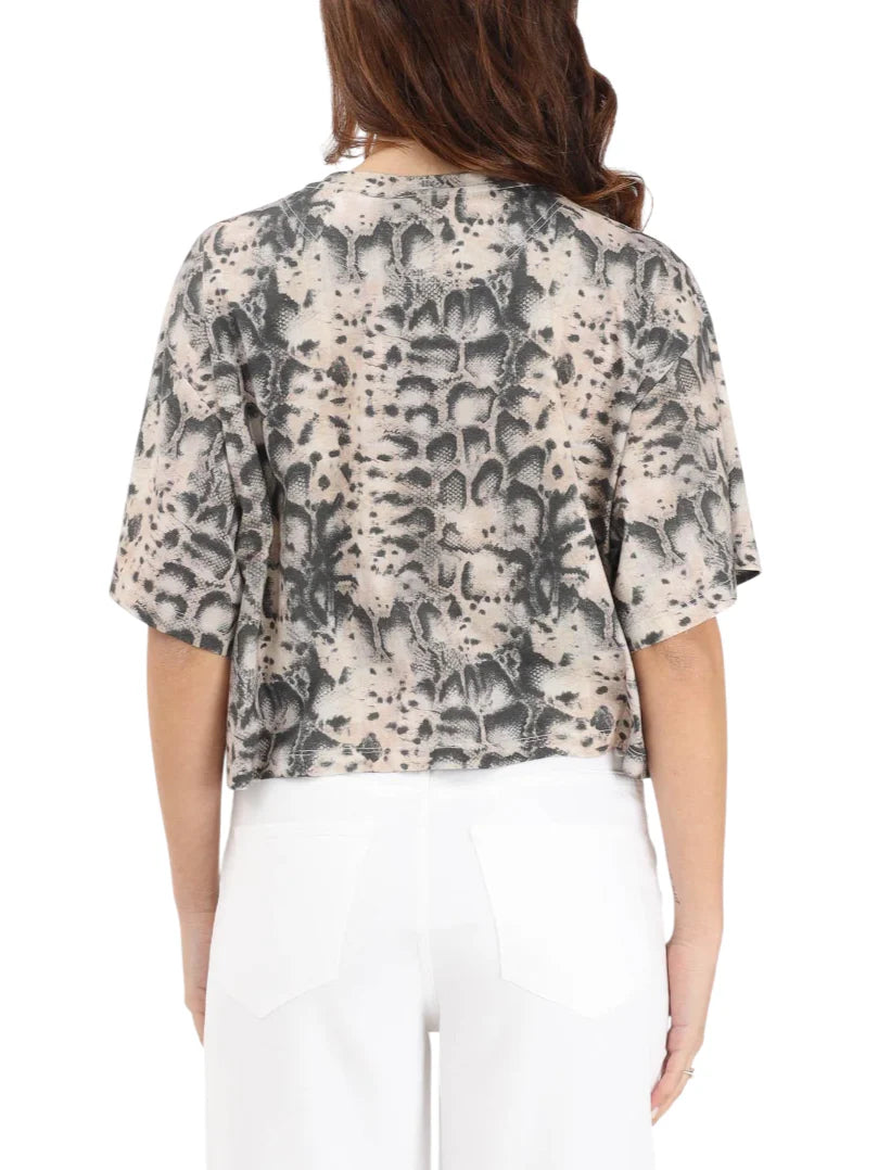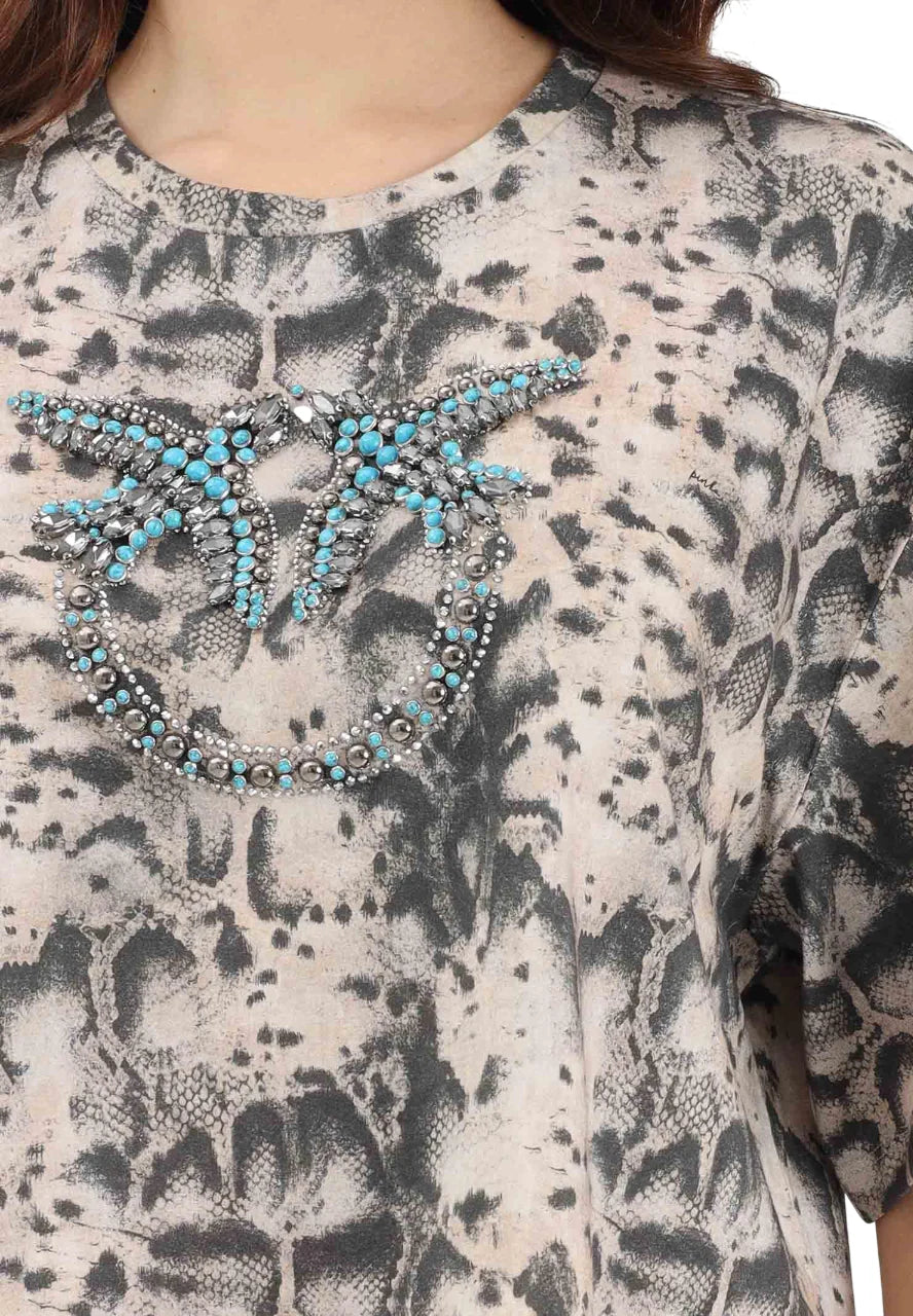 T-shirt da donna realizzata in jersey di cotone con stampa pitonata. Logo Love Birds con applicazioni gioiello. Taglio cropped. 100% cotone