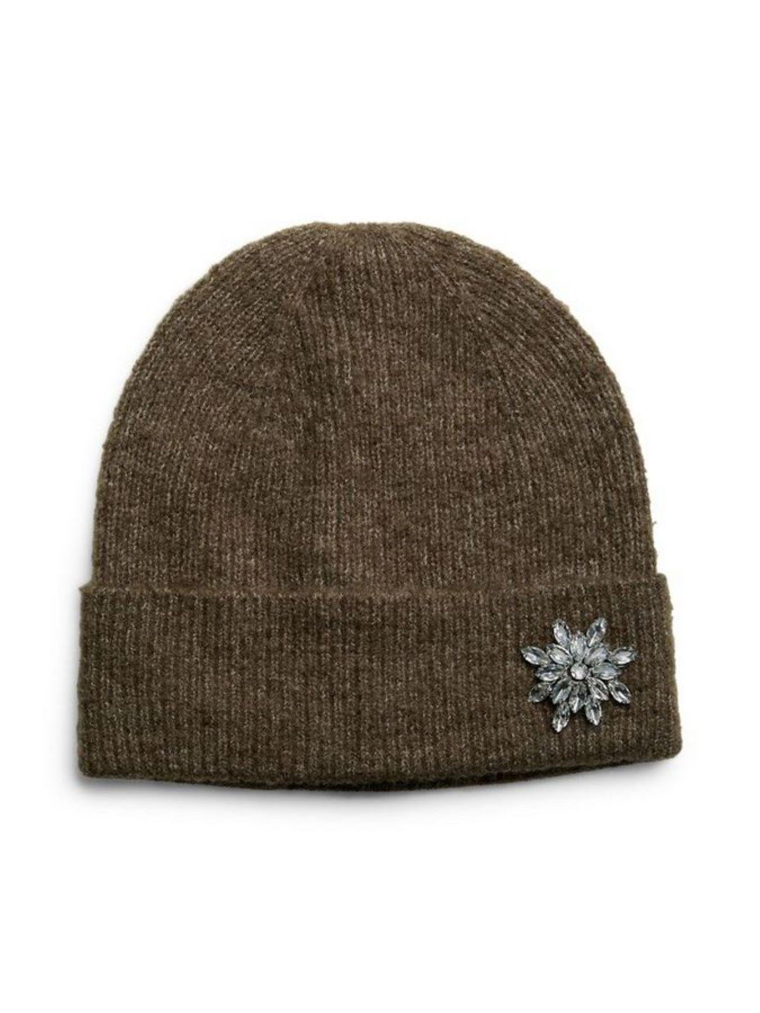 Cappello da donna realizzato in maglia con interventi lurex. Dettaglio gioiello sul risvolto. 52% poliestere 25% acrilico 20% nylon 3% elastan