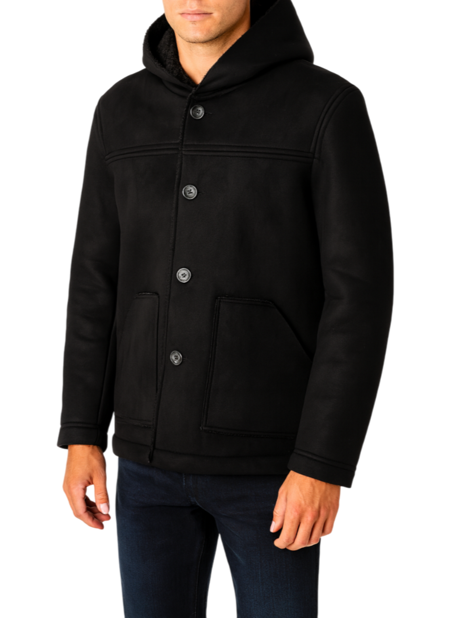 Giubbino stile montoncino ecologico da uomo foderato internamente in tessuto sherpa. Cappuccio fisso, apertura frontale con bottoni. Tasche sul davanti. 98% poliestere 2% elastan