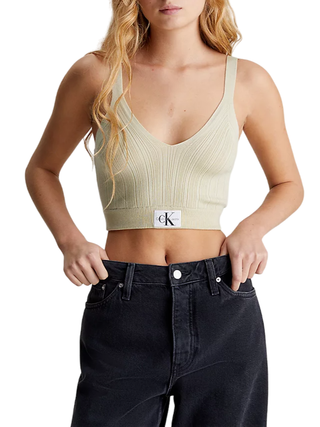 Top corto da donna realizzato in maglia a costine. Modello smanicato, patch con logo sul fondo. Vestibilità cropped.78% lyocell 22% poliammide