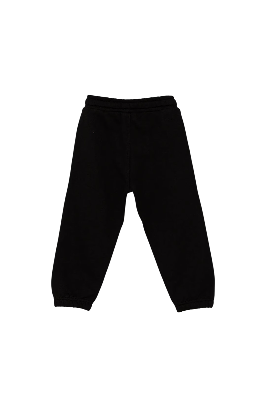 Pantaloni da bambino in felpa. Vita elasticizzata con coulisse, polsini elasticizzati. Patch logato sul davanti. 100% cotone