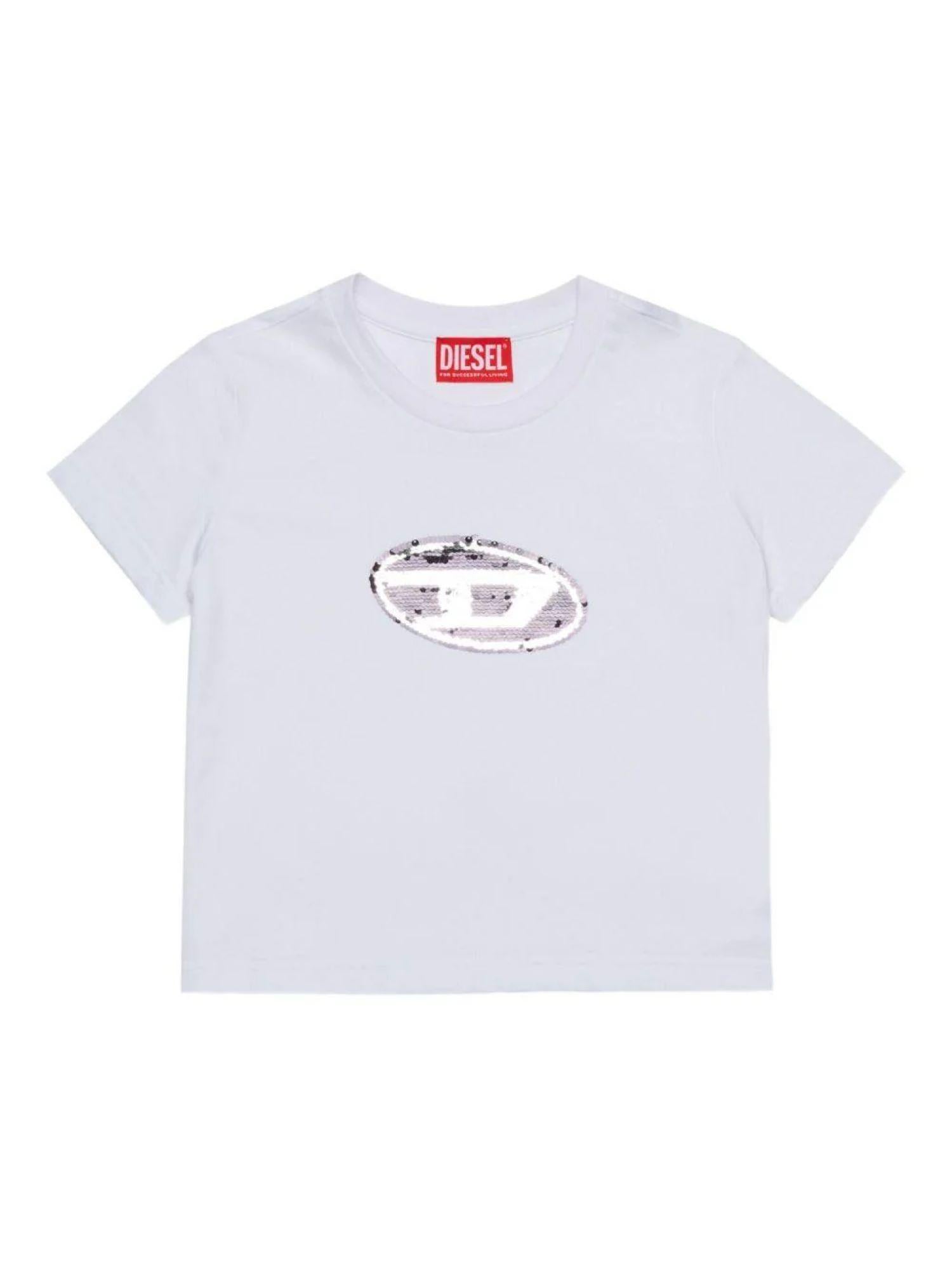 T-shirt da bambina realizzata in jersey di cotone. Girocollo, maniche corte. Il davanti è caratterizzato dal logo iconico con paillettes. 100% cotone
