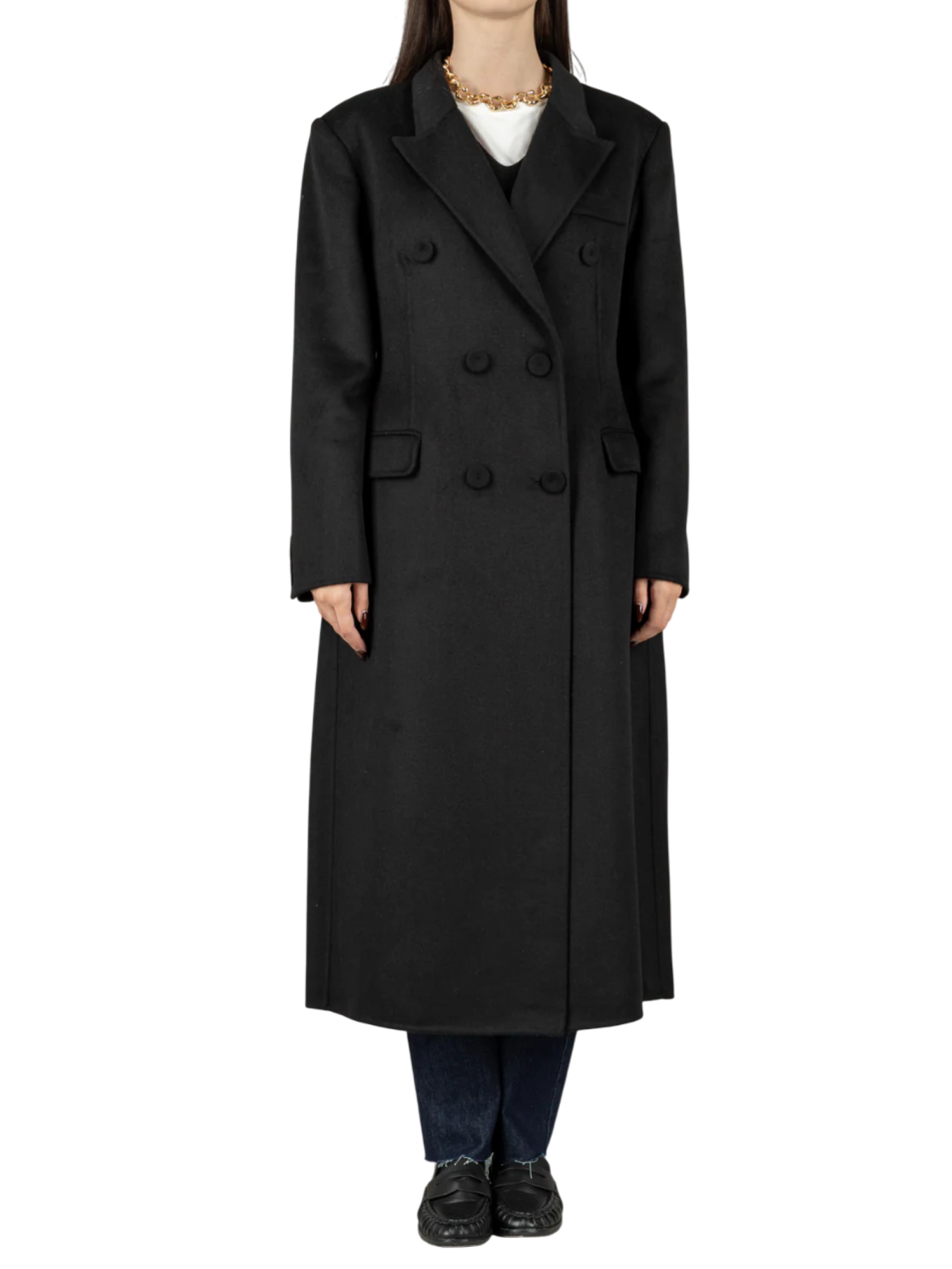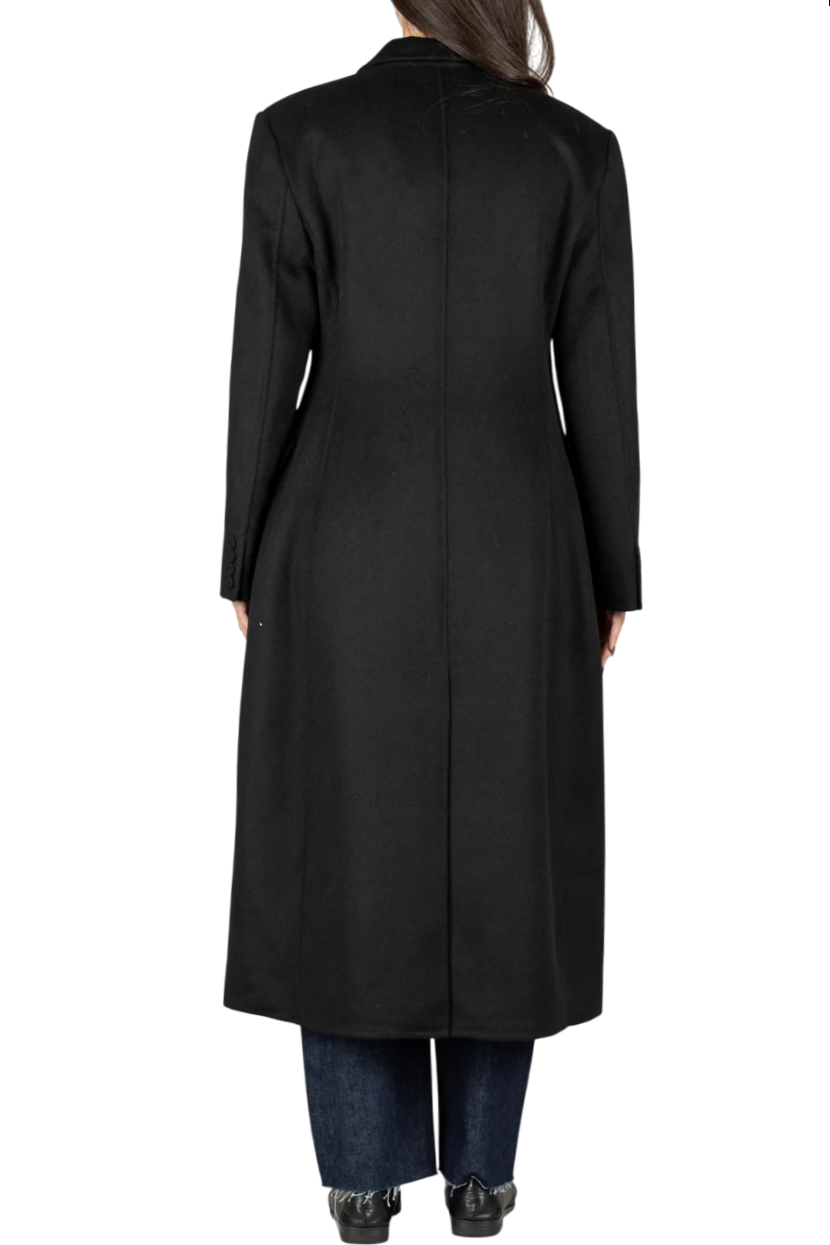 Cappotto lungo da donna realizzato in panno misto lana. Abbottonatura doppiopetto con bottoni rivestiti in panno tono su tono. Collo con revers a lancia, tasche con patta. 50% lana 50% poliestere