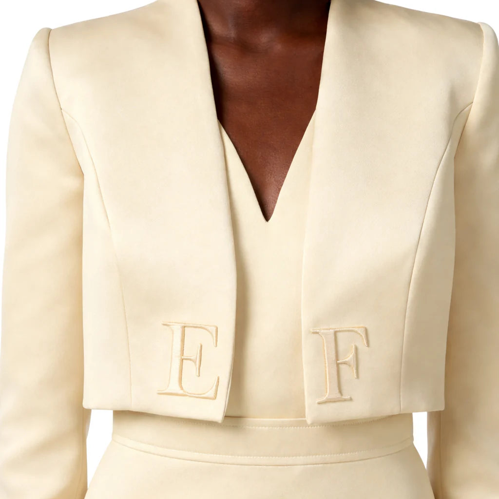 Completo elegante da donna composto da abito e coprispalle in duchesse. Abito corto smanicato con profondo scollo a V. Il retro è caratterizzato da trasparenze grazie alle parti in tulle e da una profonda apertura. Chiusura posteriore con zip invisibile. Giacchina corta coordinata in duchesse con maniche 3/4, spalline imbottite e il logo iconico EF tono su tono sul davanti. Questo completo è perfetto per una donna chic e raffinata: indossalo ad un evento, un party o un'occasione speciale. 100% poliestere