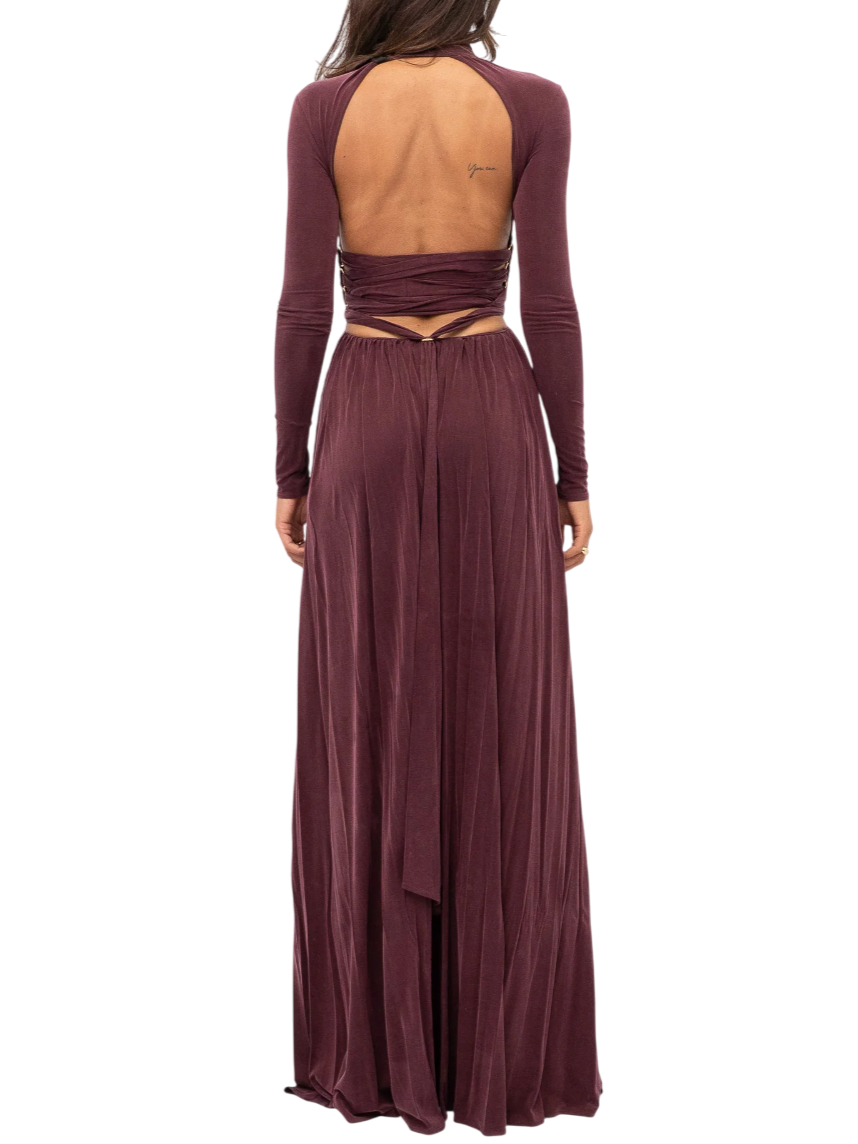 Abito lungo da donna realizzato in jersey cupro caratterizzato da una lavorazione plissè. Apertura profonda sul davanti, colletto drappeggiato con bottoncini in galvanica dorata. Maniche lunghe, schiena scoperta impreziosita da un'allacciatura incrociata. Profondo spacco laterale. 92% cupro 8% elastan