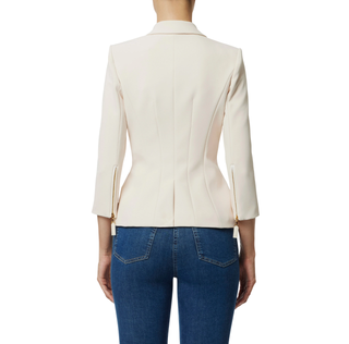 Giacca blazer da donna in tessuto crepe. Abbottonatura doppiopetto impreziosita da bottoni smaltati con logo. Tasche con patta con profili in ecopelle, maniche 3/4 con zip sul fondo. Spalline imbottite. Linea affancata. Abbina questa giacca ad un pantalone palazzo per un look femminile e di carattere. 96% poliestere 4% elastan