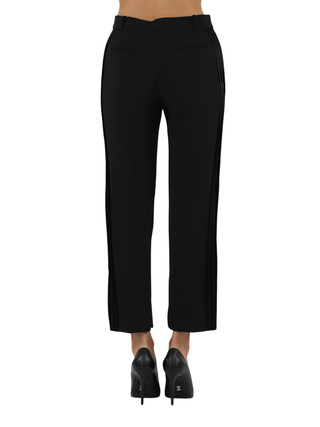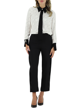 Pantaloni da donna realizzati in tessuto crepe stretch. Vita alta con passanti, chiusura con cerniera e gancetti nascosti. I lati delle gambe sono caratterizzati da una pieghettatura in raso e da un piping con logo. Gamba slim con spacchetto sul fondo. 95% poliestere 5% elastan